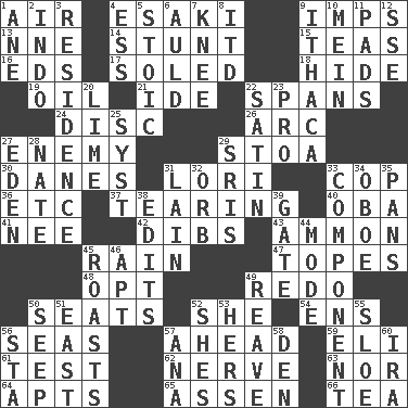 ACROSS 1. Atmosphere 4. 1973 Nobel Price Winner (Physics) Leo 9. Naughty children 13. Compass dir. 14. Difficult or unusual or dangerous feat 15. Beverages made from leaves 16. Begley and Asner 17. Having a sole or soles 18. Flintstone garb 19. Lubricate 21. Binary compound 22. Connects, as a bridge 24. Plate 26. Curve 27. Foe 29. Portico 30. Natives or inhabitants of Denmark 31. Australian parrot (variant) 33. Police officer (slang) 36. And so on (abbr.) 37. Pulling into pieces 40. Chief or king in Benin or Nigeria 41. Born 42. Claim 43. ID or VA city 45. Water falling in drops from the sky 47. Drinks excessively 48. Choose 49. Make new 50. Theater features 52. A female animal or person 54. Followers of ems 56. Oceans 57. At or in the front 59. Connecticut Ivy Leaguer 61. Trial 62. Boldness 63. Not either 64. Tenement units (abbr.) 65. NE Netherlands city 66. Afternoon social gathering DOWN 1. A saturated hydrocarbon 2. Southeast Asian peninsula 3. Home 4. Curvy letter 5. Unemotional 6. Old (Scot.) 7. Leg joint 8. It would 9. New York city 10. Count _ (2 wds.) 11. Writing tablets 12. Compass dir. 20. Welles in "The Third Man" 22. Smooth fabric 23. Adept person 25. System (abbr.) 27. Genesis locale 28. Nathan's nickname 29. Indian titles of respect 31. (Had) reclined 32. Globe 33. Piece 34. Mitch Miller's instrument 35. Baking dishes 38. Prepares for publication 39. Yard entry 44. Method 45. Cooks with dry heat, as in an oven 46. Fitting 49. Rob, plunder, or pillage 50. Ooze 51. 90 degrees 52. "______ My Girl" (Turtles hit) 53. Possessive pronoun 55. _ gin 56. R.R. building 57. Santa ___, CA 58. Lair 60. Lyricist Gershwin