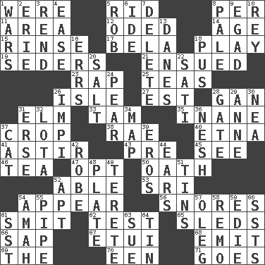 ACROSS 1. Past tense of be (plural) 5. To free from 8. For each 11. Length times width 12. Wrote a lyric poem 14. Personal question 15. Remove soap 17. Actor Lugosi 18. Live dramatic performance 19. Spring feasts 21. Took place subsequently 23. Strike 25. Afternoon social gatherings 26. Capri or Wight 27. Eastern Standard Time (abbr.) 28. Separate the seeds from cotton 31. Shade tree 33. Scottish cap 35. Silly 37. Riding implement 38. Actress Charlotte 40. Inactive volcano in Sicily 41. Having gotten out of bed 43. Before (prefix) 45. Observe 46. Beverage made from leaves 47. Choose 50. Pledge 52. Competent 53. Indian title of respect (Mr.) 54. Seem 56. Sounds asleep 61. Stricken, poetically 62. Trial 65. Bobsleighs 66. Plant excrement 67. Needle case 68. Send forth 69. Definite Article 70. Car or cant ending 71. Leaves DOWN 1. Armed conflicts 2. One of the Great Lakes 3. Tear apart 4. Comfort 5. Director Reiner 6. Binary compound 7. Keyboard key 8. Light colored 9. Mild oath 10. Marina Del _, California 13. Natives or inhabitants of Denmark 16. Blunders 18. Festering 20. Table seasoning 22. Suttee (variant) 24. Lightbulb-shaped fruit 26. Body of Kaffir warriors 28. Yard entry 29. Queen of England 1702-14 30. Teachers' org. 31. Celtic language 32. Globular water bottle used in Asia 34. Atlas unit 36. Delicate 37. Domesticated feline 39. Greek god of love 42. Loose flowing garment 44. Hearing organs 48. Food holder 49. Cigar-shaped 51. Airtight sealed metal containers 52. Fitting 54. Nanny 55. Corncob 57. Cassini of fashion 58. San ____ (Riviera town) 59. Singer Brickell 60. Fast planes 61. Fast jet (abbr.) 63. Institute legal proceedings 64. Metal container