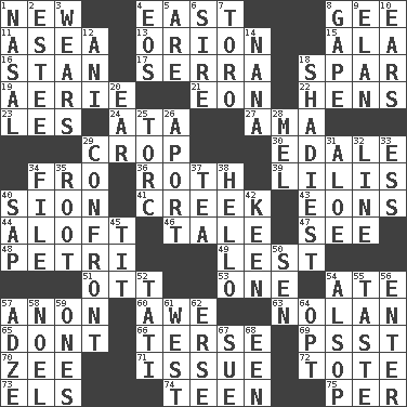ACROSS 1. ___ Haven, CT 4. Compass direction 8. Turn to the right 11. At sea 13. Constellation of myth 15. In the manner of 16. Comedian Laurel of Laurel & Hardy 17. Spanish missionary in California 18. Practice fight 19. Nest on high 21. Period of immesurable duration 22. Coop moms 23. French article 24. "One Day ___ Time" 27. Nursemaid (var.) 29. Riding implement 30. Peak District village in England 34. Away 36. Writer of Portnoy's Complaint (1969) 39. Ms. Damita and namesakes 40. The Jewish people; Israel 41. Small stream 43. Immeasurably long periods of time 44. At or to great height 46. Lie 47. Observe 48. _ dish (used to culture cells) 49. For fear that 51. Baseball player Mel 53. Single 54. Had dinner 57. At once, immediately (arch.) 60. Deep reverence 63. Pitcher Ryan 65. Do not 66. Laconic 69. Inconspicuous attention getter 70. Last letter of the English alphabet 71. Come out of 72. Carryall 73. Raised railways 74. Adolescent 75. For each DOWN 1. Rhinal 2. First name in cosmetics 3. Puts on (as clothing) 4. Greek goddess of the dawn 5. "We ___ not amused" (Victoria) 6. Beget 7. "Corrida" creature 8. Open wide 9. Liveliness 10. Hearing organs 12. Cuckoo 14. Grandmother 18. Most dubious of character or honesty 20. Ewer handle 25. Torque (variant) 26. To the left, to Queeg 28. Cartoonist voice _ Blanc 29. Meet 31. Medicinal plant 32. Actor's bit 33. Curvy letter 34. Do some clerical work 35. Carrot, for example 37. Afternoon social gathering 38. Phone greeting 40. Plant excrement 42. Peachy ____! 45. Teat (slang) 50. Elected rep. 52. Jacques of French films 54. Columnist Joseph or Stewart 55. Clothes sense 56. Keyboard key 57. Axlike tool, used for shaping wood 58. Christmas carol 59. Singles 61. 270 degrees 62. Celtic language 64. Elect 67. Take to court 68. Car or cant ending