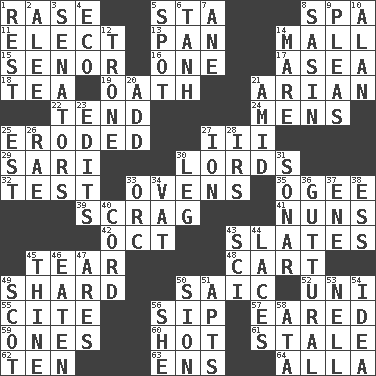ACROSS 1. Raze (variant) 5. R.R. building 8. Health resort 11. Choose 13. Baking dish 14. Promenade 15. Sir (Sp.) 16. Single 17. At sea 18. Beverage made from leaves 19. Pledge 21. Believer in; advocate of (suffix) 22. Look after 24. Not women's 25. Eaten away 27. One more than two 29. Indian skirt 30. Nobles 32. Trial 33. Baking chambers 35. Double curve, resembling the letter S 39. Lean end of the neck 41. Religious women 42. Sep. follower 43. Chalkboards 45. Pull apart 48. Haul 49. Broken piece 50. Ketch in the Levant 52. Single; one (prefix) 55. Quote 56. Small drink 57. Having ears or earlike features 59. Singles 60. Being at a high temperature 61. Lacking originality or spontaneity 62. Nine, plus one 63. Followers of ems 64. Silent film actress Nazimova DOWN 1. Remainder 2. Toward shelter 3. Elected representatives 4. Environmental prefix 5. Blemish 6. Hyperbolic tangent 7. A saturated hydrocarbon 8. Indian antelope 9. Entreaties 10. Actor Alda or Thicke 12. Heavy duty weighing machine 14. Female horse 20. Say or write further 21. Among 23. Prepares for publication 25. Eastern Standard Time (abbr.) 26. Actress Charlotte 27. Electrically charged atom 28. Big collection agency 30. Part of a journey 31. Underwater navigation system 33. The grampus (Milton) 34. Large container 36. From the throat 37. Compass dir. 38. Double-curved letter 40. Drawstring 43. _-fi 44. Shoestrings 45. One or ones belonging to thee 46. Eroded 47. Ancient Greek god of war 49. Highlander 50. The Jewish people; Israel 51. Tenement units (abbr.) 53. 1994 drama film starring Jodie Foster 54. The main thing one is thinking about 56. A female animal or person 58. "One Day ___ Time"