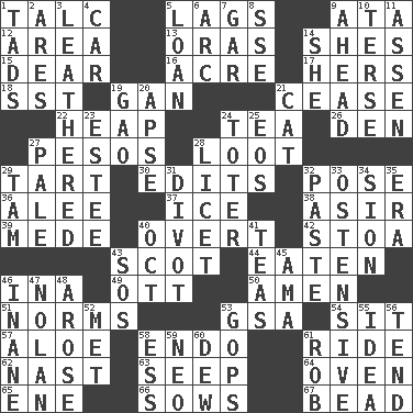 ACROSS 1. Baby powder 5. Falls behind 9. "One Day ___ Time" 12. Length times width 13. Mouths or openings 14. "______ My Girl" (Turtles hit) 15. Letter starter 16. 43,560 square feet 17. Possessive pronoun 18. Fast jet (abbr.) 19. Separate the seeds from cotton 21. Desist 22. Pile 24. Afternoon social gathering 26. Lair 27. Mexican monetary units 28. Plunder 29. Small pie 30. Prepares for publication 32. Introduce or present, as a question 36. Toward shelter 37. Frozen water 38. SW Saudi Arabia district 39. Ancient Persian 40. Unconcealed 42. Portico 43. Native of Scotland 44. Ingested 46. _ tizzy (2 wds.) 49. Baseball player Mel 50. So be it 51. Typical standards 53. Girls' org. (abbr.) 54. Be seated 57. _ vera 58. Inside; within (prefix) 61. Travel on or in a vehicle 62. Political cartoonist Thomas 63. Ooze 64. Baking chamber 65. Compass dir. 66. Sty mamas 67. Necklace unit DOWN 1. Bits 2. Ancient Greek god of war 3. Resembling or made to resemble leather 4. Automobile 5. Grant temporary use of 6. Curve 7. Slender fish 8. Compass dir. 9. Having the leading position 10. Laconic 11. NE Netherlands city 14. A female animal or person 19. E Mali city 20. Domed church section 21. Feline 23. First name in cosmetics 24. Carrier 25. Greek goddess of the dawn 27. Light colored 28. It is permitted: Lat. 29. Scottish cap 31. A piece of turf (Scot.) 32. Thick mixture 33. Clearly or manifestly demonstrative 34. The Jewish people; Israel 35. Period 40. Sep. follower 41. Beverages made from leaves 43. Mayday 45. Nanny (var.) 46. Lacking in sense or substance 47. Pitcher Ryan 48. Came up 52. Was introduced to 53. Republicans 55. It may be bright or harebrained 56. Watch over 58. Double-curved letter 59. Modern: prefix 60. Morning condensation 61. Director Reiner