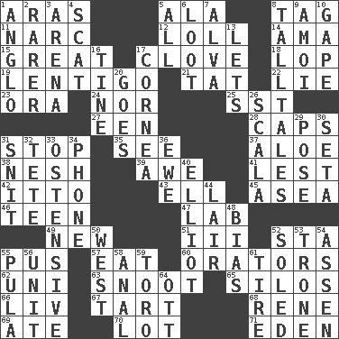 ACROSS 1. Ancient river in northeast Turkey 5. Insect wing 8. Label 11. Drug cop 12. Hang loosely or laxly 14. Nursemaid (var.) 15. Relatively large 17. Garlic unit 18. Chop off 19. Small, flat, pigmented spot on the skin 21. Make lace 22. Untruth 23. Mouth or opening 24. Or not 25. Fast jet (abbr.) 27. Car or cant ending 28. Smile enhancers 31. Halt 35. Perceive with the eye 37. _ vera 38. Soft 39. Deep reverence 41. For fear that 42. "Tell ____ the Marines!" 43. Pipe bend 45. At sea 46. Adolescent 47. Experiment locale 49. ___ Haven, CT 51. One more than two 52. R.R. building 55. Purulenc 57. Consume 60. Speakers 62. Corn or form start 63. Snob 65. Grain storage towers 66. 54 in ancient Rome 67. Small pie 68. French philosopher Descartes 69. Had dinner 70. Car dealer's back yard 71. Genesis locale DOWN 1. White American of non-Hispanic descent 2. More uncommon 3. Sports stadium 4. Go away! 5. 100% 6. Plunder 7. Inventor's middle name 8. Baron Munchausen's specialties 9. Mine, in Marseilles 10. Stare wonderingly 13. Allows 16. Prong on a fork 17. Pupil covering 20. Travels 26. Any of the three canals of the cochlea 29. Airs 30. Bristle 31. In a ____ (agitated or irritated) 32. Wig 33. Clearly or manifestly demonstrative 34. Give a jingle 36. She-sheep 40. American author Paul (1891-1958) 44. Den 48. Prejudice 50. 270 degrees 52. Having a sole or soles 53. Marketplace scale 54. NE Netherlands city 55. Monetary unit of Botswana 56. A single undivided whole 58. Of or related to the anus 59. "Corrida" creature 61. Become fatigued 64. Baseball player Mel