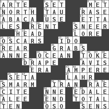 ACROSS 1. Johnson of "Laugh-In" 5. Put into a specified state 8. Was introduced to 11. Compass direction 13. The 19th letter of the Greek alphabet 14. To erase 15. Phillipine bananalike plant 16. Purpose 17. Singer James 18. French article 19. Monthly bill 21. Contemptuous expression 22. Froth on beer 24. Old wives' tales, e.g. 25. Motion picture awards 27. Wedding promise 29. Buttocks 30. Takes hold of 32. Singer Murray 33. Sea 35. Casino tip 39. Window treatment 41. Opinion 42. Period 43. Electrical Unit 45. Stalk of a moss capsule 48. Cowardly lion portrayer 49. Excessive but superficial compliments 50. SW Asia republic 52. Actress Charlotte 55. Quote 56. Compass dir. 57. Peak District village in England 59. Toward shelter 60. Conclusion 61. Add up to 62. "___ Little Indians" 63. Bear (Spanish) 64. Elected reps. DOWN 1. Of or related to the anus 2. Loose flowing garment 3. File 13 4. And so on (abbr.) 5. Surprise greatly 6. 90 degrees 7. Third day of the wk. 8. Mother 9. First name in cosmetics 10. Pull into pieces 12. Ethiopian city, capital of Harari 14. Former U.S. Attorney General Janet 20. Begley and Asner 21. Oscar Madison type 23. Having ears or earlike features 25. Mouth or opening 26. Elected rep. 27. Lyricist Gershwin 28. One of the 12 tribes of Israel 30. Unit of force equal to gravity 31. Staphylococcus 33. Boat paddle 34. Accounting whiz (abbr.) 36. Make much ado about nothing 37. Apertif with cassis 38. Compass dir. 40. 480, 500 or 516 sheets of paper 43. Insect wing 44. French painter Edouard 45. Grin 46. Eroded 47. Family _ (genealogy) 49. Leave at once 50. Lodging establishments 51. Make new 53. Actor Alda or Thicke 54. Snakelike fish 56. Modern: prefix 58. Two (Sp.)