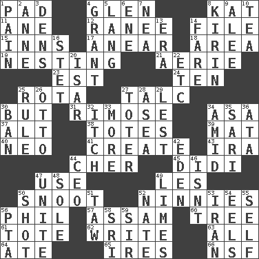 ACROSS 1. Writing tablet 4. Small, secluded valley 8. Krazy ___ of comics 11. One (Scot) 12. Indian princess (variant) 14. Do some clerical work 15. Lodging establishments 17. Approach 18. Type of rug 19. Nestling 21. Nest on high 23. Eastern Standard Time (abbr.) 24. "___ Little Indians" 25. Round or rotation of duties 27. Baby powder 30. Yet 31. Full of chinks, cracks, or crevices 34. White ___ sheet 37. The first octave above the treble staff 38. Lugs 39. Floor protector 40. Modern: prefix 41. Cause to be 43. Retirement account (abbr.) 44. "Mermaids" star 45. "You Light Up My Life" star Conn 47. Purpose 49. French article 50. Snob 52. Simpletons 56. Silvers or Donahue 57. Indian state 60. Woody plant 61. Lug 62. Compose 63. Everything 64. Had dinner 65. Angers 66. Science/research agcy. DOWN 1. Ache 2. Queen of England 1702-14 3. Cub Scout units 4. Monetary aid 5. Austrian-born American filmmaker Fritz 6. Compass dir. 7. Teachers' org. 8. Japanese brewing company 9. Toward shelter 10. Afternoon social gathering 13. Period 14. Conductor's collection 16. Proofreading order 20. Austrian river, tributary to the Danube 22. And so on (abbr.) 25. General guideline 26. Von Bismarck 27. Carrier 28. Toward the sea 29. For fear that 30. Forbid 32. Hankering 33. Greater amount 34. Among 35. Indian skirt 36. _ moment's notice (2 wds.) 42. Genesis locale 44. Corporate head (abbr.) 46. Is not 47. Join together 48. Not divided or shared with others 49. Citrus fruits 50. Guess 51. The 23rd letter of the Hebrew alphabet 52. Nathan's nickname 53. SW Asia republic 54. Snakelike fish 55. Automatically 56. Parent Teacher Association (abbr.) 58. Indian title of respect (Mr.) 59. Title for a knight