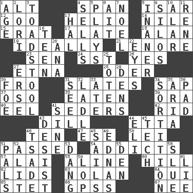 ACROSS 1. The first octave above the treble staff 4. Connect, as a bridge 8. Austrian river, tributary to the Danube 12. Thick or sticky substance 13. Sun: prefix 14. Mediterranean tributary 15. Part of Q.E.F. 17. Having winglike extensions 18. Actor Alda or Thicke 19. Under perfect conditions 21. Poe poem 23. Elected rep. 24. Fast jet (abbr.) 26. Affirmative reply 27. Inactive volcano in Sicily 28. River in Europe 30. From 31. Chalkboards 34. Plant excrement 37. Bear (Spanish) 38. Eroded 39. Mouth or opening 40. Snakelike fish 41. Spring feasts 42. To free from 43. Deli pickle 44. Singer James 46. Nine, plus one 47. Compass dir. 50. Luau accessory 51. Went by 54. Inveterate users 57. Mountain range southwest of Kyrgyzstan 58. Place in a line 60. Land elevation 62. Flaplike coverings 63. Pitcher Ryan 64. Fr. "Yes" 65. Proofreading order 66. Global Positioning Systems (abbr.) 67. Born DOWN 1. Mature 2. Australian parrot (variant) 3. Inedible or poisonous agaric 4. Makes a sale 5. Live dramatic performances 6. Small island 7. Christmas carol 8. More empty; more void 9. Grain storage towers 10. Having or resembling wings 11. French philosopher Descartes 13. Actor Linden 16. Adolescent 20. Santa ___, CA 22. Sight organs 25. Carrier 27. Celtic language 29. Cub Scout units 30. Enemy 31. Stitch closed the eyes of (a falcon) 32. Dipping utensil 33. Had dinner 34. Conclusion 35. Roberta Peters solo 36. Writing tablet 41. Trig term 43. Cease 44. Biblical high priest 45. Technical work 46. Sadhe (variant) 48. Moves on water 49. Ferber et al. 51. Friends 52. Set down 53. Mild oath, euphamism for damn 55. Lair 56. Change direction abruptly 59. Trim (branches) 61. Untruth