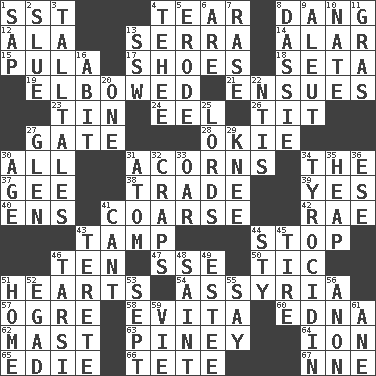 ACROSS 1. Fast jet (abbr.) 4. Pull into pieces 8. Mild oath, euphamism for damn 12. Chicken ___ king 13. Spanish missionary in California 14. Having or resembling wings 15. Monetary unit of Botswana 17. Imelda's hoard 18. Stalk of a moss capsule 19. Turned at an angle; bent 21. Follows as a consequence or result 23. Metal container 24. Snakelike fish 26. Teat (slang) 27. Yard entry 28. Migrant worker of the '30s 30. 100% 31. Oak nuts 34. Definite Article 37. Turn to the right 38. Barter 39. Affirmative reply 40. Followers of ems 41. Rough 42. Actress Charlotte 43. Pack (down) 44. Halt 46. "___ Little Indians" 47. Compass dir. 50. Nervous spasm 51. Centers 54. Nineveh was its capital 57. Legendary monster 58. Webber/Rice musical 60. Pulitzer Prize-winning author Ferber 62. Vertical spar for supporting sails 63. Abounding in pines 64. Electrically charged atom 65. Singer Brickell 66. False hair 67. Compass dir. DOWN 1. Plant excrement 2. Change direction abruptly 3. Baron Munchausen's specialties 4. Giggle 5. Eat (away) 6. "We ___ not amused" (Victoria) 7. Raze (variant) 8. Hyrax 9. Native American of Southwest Alaska 10. Nathan's nickname 11. Pate de foie ____ 13. Compass dir. 16. "This won't hurt ____!" 20. Single 22. Nuclear Threat Initiatives 25. Titled peers of a realm 27. Small, secluded valley 29. Leg joint 30. Mature 31. Tiny particle 32. Dice game 33. Rowing implement 34. Polypeptide antibiotic 35. Pile 36. Compass dir. 41. Patter 43. Cigar-shaped 44. Filthy place 45. Hoop that covers a wheel 46. Tarsus (plural) 48. Virtuous person 49. First name in cosmetics 51. Residence 52. Mild oath 53. Back-to-school mo. 55. Declare 56. At once, immediately (arch.) 59. Compete 61. A saturated hydrocarbon