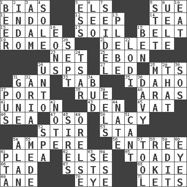 ACROSS 1. Prejudice 5. Raised railways 8. Institute legal proceedings 11. Inside; within (prefix) 12. Ooze 14. Beverage made from leaves 15. Peak District village in England 17. Land 18. Waist strap 19. Lover boys 21. Erase 23. Fish or hair follower 25. Inky black, to poets 26. United States Postal Service (abbr.) 27. Directed 28. Mountains (abbr.) 31. Separate the seeds from cotton 33. Bar bill 35. Potato state 37. Sweet dark-red dessert wine 38. Sorrow 40. Caspian sea tributary 41. The state of being joined or united 43. Lair 45. Large container 46. Ocean 47. Bear (Spanish) 50. Made of lace 52. Move through with a circular motion 53. R.R. building 54. Electrical Unit 56. Main course 61. Entreaty 62. Otherwise 65. Sycophant 66. Small boy 67. Fast planes 68. Migrant worker of the '30s 69. A saturated hydrocarbon 70. Sight organ 71. Allows DOWN 1. Fermented drink made from hops 2. Southeast Asian peninsula 3. First of billions? 4. Not divided or shared with others 5. Double-curved letter 6. Lion 7. Beer mug 8. Proofreading order 9. Ubangi River tributary 10. Consume 13. Cadet 16. Immeasurably long periods of time 18. Benjamin's nick name 20. Back-to-school mo. 22. Farming town in central California 24. Russian ruler of old 26. To (old English) 28. Hindu Mythology: god of death 29. Not this but _ 30. Mayday 31. Went 32. Operatic vocal solo 34. Partially opened flower 36. American folk hero Crockett 37. Purulenc 39. Snakelike fish 42. Observe 44. Nathan's nickname 48. Fathers 49. Threatening words 51. Patter 52. Health resort 54. Actor Alda or Thicke 55. Ancient Persian 57. Implement 58. Immoral or dissolute person 59. Prepare for publication 60. Sight organs 61. Parent Teacher Association (abbr.) 63. Filthy place 64. Compass dir.