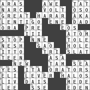 ACROSS 1. Ancient river in northeast Turkey 5. Deep reverence 8. Make lace 11. Drug cop 12. Electrical Unit 14. Bear (Spanish) 15. Relatively large 17. Ethiopian city, capital of Harari 18. Alias (abbr.) 19. Small, flat, pigmented spot on the skin 21. Compass dir. 22. June honoree 23. Mouth or opening 24. Before (prefix) 25. Greek goddess of the dawn 27. One more than two 28. Tiny particle 31. Close up, plug up 35. Compass dir. 37. Lacquered or enameled metalware 38. Soft 39. E Mali city 41. Hollow 42. "Tell ____ the Marines!" 43. Three (prefix) 45. Narrow board 46. Adolescent 47. White ___ sheet 49. ___ Haven, CT 51. Scottish cap 52. Ocean 55. Affirmative reply 57. Call ___ day 60. Speakers 62. Connecticut Ivy Leaguer 63. Prying instrument 65. Rings 66. 54 in ancient Rome 67. Raised platform 68. Ancient Persian 69. Area sheltered from the wind 70. Compass dir. 71. Locale of original sin DOWN 1. White American of non-Hispanic descent 2. More uncommon 3. Sports stadium 4. Jazz singing style 5. Actress Gardner 6. Had on 7. Enthusiasm 8. Inedible or poisonous agaric 9. "____ silly question..." 10. Frog relative 13. Family _ (genealogy) 16. Native american tent (variation) 17. Cultivating 20. Amused look 26. Curses 29. Water jar 30. Confront 31. In a ____ (agitated or irritated) 32. False hair 33. Clearly or manifestly demonstrative 34. Give a jingle 36. Consume 40. Speaker 44. Austrian river, tributary to the Danube 48. Housemaid 50. Uncontrolled 52. Having a sole or soles 53. Wear away 54. NE Netherlands city 55. Shout 56. Writer Wiesel 58. Beverages made from leaves 59. Advice 61. Not wild 64. Compass dir.