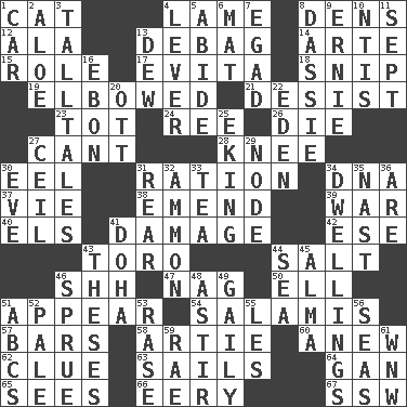 ACROSS 1. Feline 4. Unable to walk 8. Hiding places for outlaws 12. Insect wing 13. Debunk (Brit. slang) 14. Johnson of "Laugh-In" 15. Hero or heavy, e.g. 17. Webber/Rice musical 18. Clip 19. Turned at an angle; bent 21. Cease 23. Small child 24. To sift 26. Pass on 27. Patter 28. Leg joint 30. Snakelike fish 31. Food allowance for one day 34. Heredity factor (abbr.) 37. Compete 38. Make improvements or corrections to 39. Armed conflict 40. Raised railways 41. Break 42. Compass dir. 43. "Corrida" creature 44. Table seasoning 46. Quiet! 47. Tired old horse 50. Pipe bend 51. Become visible 54. Deli grouping 57. Drinking establishments 58. Nick name for Arthur 60. Afresh 62. A slight indication 63. Moves on water 64. Separate the seeds from cotton 65. Observes 66. Suggestive of the supernatural 67. Compass dir. DOWN 1. Automobile 2. Medicinal plant 3. Baron Munchausen's specialties 4. Prying instrument 5. Stay 6. Floor covering 7. Mild oath 8. Hyrax 9. Bert's buddy 10. Nuclear Threat Initiatives 11. Back-to-school mo. 13. Morning condensation 16. Inky black, to poets 20. Baseball player Mel 22. Genesis locale 25. Supplementing with great effort 27. To provide with a ceiling 29. Thickened enlargement 30. Night before a holiday 31. Stern 32. ID or VA city 33. Afternoon social gathering 34. Homes 35. Political cartoonist Thomas 36. "We ___ not amused" (Victoria) 41. Capital of the state of Qatar 43. College papers 44. Ocean 45. _ mater 46. Disorder 48. Moving about 49. Lightheartedly 51. Lettered men learn these first 52. Light colored 53. To erase 55. French article 56. Oceans 59. Actress Charlotte 61. Compass dir.