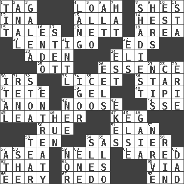 ACROSS 1. Label 4. Rich soil 8. "______ My Girl" (Turtles hit) 12. _ tizzy (2 wds.) 13. Silent film actress Nazimova 14. Command 15. Falsehoods 18. Remaining after all deductions 19. Type of rug 20. Small, flat, pigmented spot on the skin 22. Begley and Asner 23. An important port of Yemen 24. Connecticut Ivy Leaguer 25. Baseball player Mel 26. Core 30. Big collection agency 33. It is permitted: Lat. 36. Play the lead 37. False hair 39. Set 40. Native american tent (variation) 41. Soon (poet.) 42. Trap for birds or small mammals 44. Compass dir. 45. Cordwainer's material 47. Cask 50. Regret 51. Flair 53. Nine, plus one 54. More lively and spirited 57. At sea 59. 1994 drama film starring Jodie Foster 61. Having ears or earlike features 63. Not this but _ 64. Singles 65. By way of 66. Suggestive of the supernatural 67. Make new 68. Conclude DOWN 1. Teat (slang) 2. Of or related to the anus 3. An organ shaped like a helmet 4. Long (Scottish) 5. Margarine 6. The first octave above the treble staff 7. Floor covering 8. Most dark, concealed or hidden 9. Possessive pronoun 10. Compass dir. 11. R.R. building 16. Inside; within (prefix) 17. Proofreading order 21. International (abbr.) 22. Raised railways 24. Eastern Standard Time (abbr.) 26. Snakelike fish 27. Nuclear Threat Initiatives 28. Smile enhancers 29. 4th largest of the Great Lakes 30. Slanted text style (abbr.) 31. French philosopher Descartes 32. Portico 34. Composer Stravinsky 35. Corporate head (abbr.) 38. Plea 42. Born 43. Makes supply last 46. Attila the _ 48. Otherwise 49. Greek goddess of the earth (variant) 52. Boldness 53. Rend 54. Downhill vehicle 55. In addition 56. It's straight from the horse's mouth 57. Had dinner 58. A female animal or person 59. Not either 60. Compass dir. 62. June honoree
