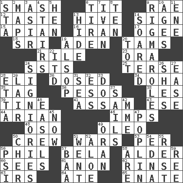ACROSS 1. Box-office sellout 6. Teat (slang) 9. Actress Charlotte 12. Clothes sense 13. Hub of activity 14. Omen 15. Bee-related 16. SW Asia republic 17. Double curve, resembling the letter S 18. Indian title of respect (Mr.) 19. An important port of Yemen 20. Scottish caps 21. Cause heat under the collar 23. Mouth or opening 24. Fast planes 25. Laconic 28. Connecticut Ivy Leaguer 30. Administered medicine 34. Capital of the state of Qatar 35. Label 36. Mexican monetary units 38. French article 39. Prong on a fork 41. Indian state 43. Compass dir. 44. Believer in; advocate of (suffix) 46. Naughty children 48. Bear (Spanish) 49. Butter sub 50. Group working together 51. Armed conflicts 53. For each 56. Silvers or Donahue 57. Actor Lugosi 58. Tree or shrub in the Birch family 60. Observes 61. Soon (poet.) 62. Wash lightly 63. Big collection agency 64. Had dinner 65. Related on the mother's side DOWN 1. R.R. building 2. Atlas contents 3. SW Saudi Arabia district 4. Flight of steps 5. Layer 6. Hoop that covers a wheel 7. "Terrible" tsar 8. "___ Little Indians" 9. Complicated, petty procedures 10. Eras 11. Compass dir. 13. Flintstone garb 14. Flew 19. Columnist Joseph or Stewart 20. Small child 22. It would 24. Seigniories (variant) 26. "______ My Girl" (Turtles hit) 27. Relaxation 28. Singer James 29. Den 31. Ocean 32. Curvy letter 33. Two (Sp.) 37. Travel by water 40. Artist's stands 42. Madame (abbr.) 45. At this time 47. Cotton for raincoats, e.g. 49. NW Algerian seaport 50. "Mermaids" star 51. Left 52. _ vera 54. Pulitzer Prize-winning author Ferber 55. Take ten 56. 23rd letter of the Greek alphabet 57. Sound made by sheep 58. "We ___ not amused" (Victoria) 59. To sift