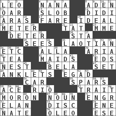 ACROSS 1. Lion 4. Nanny 8. Arabian gulf 12. Boat paddle 13. Oscar Madison type 14. "You Light Up My Life" star Conn 15. Caspian sea tributary 17. Conductor's collection 18. Perfect 19. Distance measurement 21. Make lace 23. Madame (abbr.) 24. Prevent from occurring 26. R.R. building 28. Observes 30. Of or relating to Laos or its people 34. And so on (abbr.) 37. Silent film actress Nazimova 39. Roberta Peters solo 40. Beverage made from leaves 41. Women servants 43. Begley and Asner 44. Egg locale 46. Actor Lugosi 47. Arrange properly for use 48. Short socks 51. Mild oath 54. Auto 55. Practice fights 58. Adept person 61. River (Sp.) 63. Distinguishing feature 65. Person of subnormal intelligence 67. Part of speech 71. Engineer (abbr.) 72. Style 73. Compact _ 74. Compass dir. 75. Nathan's nickname 76. Margarine 77. Compass dir. DOWN 1. Rich soil 2. Having ears or earlike features 3. Declaim 4. Science/research agcy. 5. According to 6. Or not 7. Collude with 8. Say or write further 9. South Vietnam president (1954) 10. Dutch treat 11. Mediterranean tributary 16. Puts into a specified state 18. "Tell ____ the Marines!" 20. To separate or throw off 22. White ___ sheet 25. 480, 500 or 516 sheets of paper 27. "One Day ___ Time" 29. Broad, flat, thick pieces 30. Dipping utensil 31. Angers 32. Helper 33. Political cartoonist Thomas 34. Inactive volcano in Sicily 35. Adolescent 36. Keg 38. Untruth 42. Droops 45. Affectionate concern, for short 49. Merit 50. Three (prefix) 52. Fitting 53. Have the gumption 56. Indian princess (variant) 57. Attaches a signature 58. So be it 59. Root beer relative 60. Part of Q.E.F. 62. Southwest Nigerian state 64. Woody plant 66. Single 68. Lubricate 69. Purpose 70. Non-commissioned officer (abbr.)