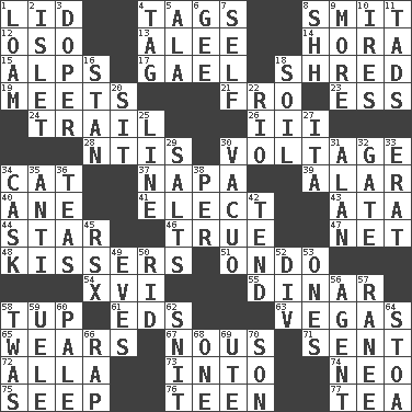 ACROSS 1. Flaplike covering 4. Labels 8. Stricken, poetically 12. Bear (Spanish) 13. Toward shelter 14. Israeli folk dance 15. High mountains 17. Highlander 18. Tear up 19. Confronts 21. Away 23. Curvy letter 24. Hang back 26. One more than two 28. Nuclear Threat Initiatives 30. Electrical Measurement 34. Domesticated feline 37. California wine valley 39. Having or resembling wings 40. One (Scot) 41. Opt 43. _ moment's notice (2 wds.) 44. Play the lead 46. Loyal 47. Fish or hair follower 48. Smoochers 51. Southwest Nigerian state 54. 16 55. Middle Eastern gold or silver currency 58. Uncastrated adult male sheep 61. Begley and Asner 63. Viva Las _ 65. Puts on (as clothing) 67. Horse sense 71. Emitted 72. Silent film actress Nazimova 73. To the inside or interior of 74. Modern: prefix 75. Ooze 76. Adolescent 77. Afternoon social gathering DOWN 1. Rich soil 2. Small island 3. Drug addict 4. Label 5. Wing 6. Turn to the right 7. Itself 8. Quiet! 9. Greater amount 10. Angers 11. Small boys 16. Comedian Laurel of Laurel & Hardy 18. Land 20. Be seated 22. River (Sp.) 25. Actor's bit 27. Call ___ day 29. Table seasonings 30. In a vacuum (with "in") 31. ____ Jay Lerner 32. Yard entry 33. Part of Q.E.F. 34. Keg 35. Against 36. Afternoon social gatherings 38. For each 42. Look after 45. Acura sports coupe 49. Nights before holidays 50. To free from 52. HTML Container Element 53. Washington bills 56. Rep 57. The wife of a rajah (variant) 58. It was, poetically 59. Ubangi River tributary 60. Light colored 62. In a ____ (agitated or irritated) 64. Portico 66. Hit sharply and swiftly 68. Single 69. Shoshoni 70. Boy, to dad