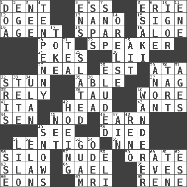 ACROSS 1. Scratch 5. Double-curved letter 8. 4th largest of the Great Lakes 12. Double curve, resembling the letter S 13. Billionth: prefix 15. Public display of a written message 16. Representative 18. Practice fight 19. Medicinal plant 20. Cooking vessel 22. Orator 24. Supplements with great effort 26. Cards in a Roman deck? 27. Actress Patricia 28. Eastern Standard Time (abbr.) 29. _ moment's notice (2 wds.) 32. Make senseless or dizzy 35. Competent 37. Tired old horse 38. Have confidence or faith in 39. The 19th letter of the Greek alphabet 40. Had on 41. Call ___ day 42. Froth on beer 43. Pismires 44. Elected rep. 45. Allow head to fall sleepily 46. Merit 49. Observe 50. Passed on 51. Small, flat, pigmented spot on the skin 55. Compass dir. 56. Grain storage tower 57. Naked 59. Declaim 63. Cole _ (cabbage dish) 64. Highlander 65. Nights before holidays 66. Immeasurably long periods of time 67. Medical imaging device (abbr.) 68. French philosopher Descartes DOWN 1. ___ good deed 2. Oval reproductive body of a fowl 3. Born 4. 3-inch nail 5. Followers of ems 6. Plant excrements 7. Fastener 8. 1973 Nobel Price Winner (Physics) Leo 9. Cause heat under the collar 10. Russian composer Stravinsky 11. Compass dir. 14. Threatening words 17. Casino tip 21. Afternoon social gathering 23. Small island 25. Scheduled 28. Evaded 29. At once, immediately (arch.) 30. Small pie 31. Grows older 32. Indian titles of respect 33. Wig 34. ____ Bator 36. Sound made by sheep 40. Nomad 42. Cultivating 45. Fish or hair follower 47. The 18th letter of the Arabic alphabet 48. Western Nevada city 49. Overwhelms 51. _ and Stitch 52. Flair 53. Island territory of the United States 54. River in Europe 56. Compass dir. 58. Biblical high priest 60. "___ Maria" 61. "___ Little Indians" 62. Compass dir.