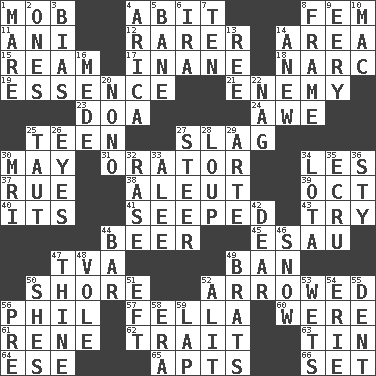 ACROSS 1. Crowd into 4. "This won't hurt ____!" 8. Opposite of masc. 11. Black tropical American cuckoo 12. Less widely known 14. Length times width 15. 480, 500 or 516 sheets of paper 17. Empty; void 18. Drug cop 19. Substance 21. Foe 23. ___ good deed 24. Deep reverence 25. Adolescent 27. Volcanic refuse 30. Can I? 31. Speaker 34. French article 37. Regret 38. Native American of Southwest Alaska 39. Sep. follower 40. ___ a Wonderful Life 41. Oozed 43. Attempt to accomplish something 44. Fermented drink made from hops 45. He sold his birthright 47. Federal power corp. 49. Prohibit 50. Dinah or Pauly 52. Moved like an arrow 56. Silvers or Donahue 57. Chap (slang) 60. Past tense of be (plural) 61. French philosopher Descartes 62. Distinguishing feature 63. Shallow baking pan 64. Compass dir. 65. Flats, for short 66. Arrange properly for use DOWN 1. Female horse 2. Washington bills 3. Prejudice 4. N. Chile seaport 5. Object of repulsion 6. Lyricist Gershwin 7. "___ Little Indians" 8. Movie unit 9. Suggestive of the supernatural 10. Big _ 13. To separate or throw off 14. Afresh 16. Ancient Persian 20. Words to Nanette 22. Tired old horse 25. Tense 26. Snake ____ (dice throw) 27. Guide 28. Central Nebraska county 29. Johnson of "Laugh-In" 30. Medical imaging device (abbr.) 32. To erase 33. Toward shelter 34. Globular water bottle used in Asia 35. Shade of tan 36. Filthy place 42. Letter starter 44. Long, evenly shaped piece 46. Frozen precipitation 47. One or ones belonging to thee 48. Short-tailed, large-bodied rat 49. Naughty children 50. "______ My Girl" (Turtles hit) 51. Bank Draft (abbr.) 52. Came down and settled, as after flight 53. Moistens 54. One of the Great Lakes 55. Scratch 56. Before (prefix) 58. Epoch 59. Pet locale