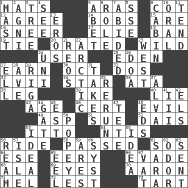 ACROSS 1. Floor coverings 5. Caspian sea tributary 9. Small bed 12. Match 14. Moves up and down 15. "We ___ not amused" (Victoria) 16. Contemptuous expression 17. Writer Wiesel 18. Forbid 19. Neckwear 20. Spoke pompously 23. Rampant 24. One who uses or employs something 25. Locale of original sin 27. Merit 30. Sep. follower 32. Two (Sp.) 33. 57 in ancient Rome 34. Play the lead 36. "One Day ___ Time" 38. Part of a journey 39. D.D.E's nickname 40. Whopper 43. Personal question 46. Foregone conclusion 48. Tending to cause great harm 49. Cleo's killer 51. Take to court 52. Raised platform 53. "Tell ____ the Marines!" 54. Nuclear Threat Initiatives 56. Travel on or in a vehicle 58. Went by 61. Distress signal 64. Compass dir. 65. Suggestive of the supernatural 66. Dodge 68. Chicken ___ king 69. Sight organs 70. Composer Copland 71. Cartoonist voice _ Blanc 72. For fear that 73. Small pie DOWN 1. Vertical spar for supporting sails 2. Hindu god of fire 3. Woody plant 4. Observe 5. Collude with 6. Hero or heavy, e.g. 7. Stayed 8. Compass dir. 9. Small house or cottage 10. Of the mouth 11. Look after 13. Greek god of love 21. Vintage cars 22. Northern region 23. Compass direction 24. University (slang) 26. ___ good deed 27. Pipe bend 28. "___ Maria" 29. Port city in Latvia 31. Proceeds 35. Summer TV shows 37. Inventor's middle name 41. One more than two 42. Raised railways 44. Yard entry 45. Eastern Standard Time (abbr.) 47. Wig 48. Begley and Asner 50. Wimpy's pal 53. Perfect 55. The main thing one is thinking about 56. 480, 500 or 516 sheets of paper 57. Small island 59. Ancient Greek god of war 60. System (abbr.) 61. "Two Mules for Sister ____" 62. Aroma 63. Posted 65. Snakelike fish 67. Large container