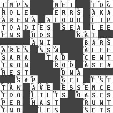 ACROSS 1. Naughty children 5. Was introduced to 8. Coat; cloak 11. Hero or heavy, e.g. 12. Blunders 14. Alias (abbr.) 15. Sports stadium 17. Verbally 18. Mouth edge 19. Sycophants 21. Ocean 22. Area sheltered from the wind 23. Followers of ems 24. Two (Sp.) 25. Krazy ___ of comics 27. Black tropical American cuckoo 28. Taverns 31. Arches 35. Compass dir. 37. Toward shelter 38. "Two Mules for Sister ____" 39. Bit 41. Penny 42. Picture 43. Friend of Pooh 45. At sea 46. Remainder 47. Heredity factor (abbr.) 49. Plant excrement 51. Set 52. Eastern Standard Time (abbr.) 55. The 23rd letter of the Hebrew alphabet 57. "___ Maria" 60. Gist 62. Wedding promise 63. Ms. Damita and namesakes 65. Fertile tracts in a desert 66. For each 67. Vertical spar for supporting sails 68. Undersized animal 69. Indiana (abbr.) 70. French article 71. Arranges properly for use DOWN 1. Feeling or showing extreme anger 2. Person of subnormal intelligence 3. Entreaties 4. Transmit 5. Cartoonist voice _ Blanc 6. Greek god of love 7. Loyal 8. Baron Munchausen's specialties 9. Migrant worker of the '30s 10. Yawn 13. Neighbor of Neb. 16. Opera by Verdi 17. Aid 20. Immeasurably long periods of time 26. Phillipine bananalike plant 29. French philosopher Descartes 30. Bristle 31. SW Saudi Arabia district 32. Immoral or dissolute person 33. What you're doing now 34. Before Barbara or Clara 36. Armed conflict 40. Evades 44. Singles 48. In addition 50. Inside of hand 52. Take place subsequently 53. Aroma 54. Trials 55. Native american tent (variation) 56. Arabian gulf 58. Small bottle 59. Otherwise 61. Hearing organs 64. ___ a Wonderful Life