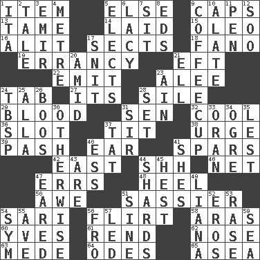 ACROSS 1. A distinct part 5. Otherwise 9. Smile enhancers 13. Not wild 14. Put down 15. Butter sub 16. Came down and settled, as after flight 17. Religious groups 18. Papal veil 19. Tendancy to err 21. Lizard (obsolete) 22. Send forth 23. Toward shelter 24. Bar bill 27. It is 28. Drop; flow; fall 29. Vital fluid 31. Elected rep. 32. Calm and collected 36. Notch 37. Teat (slang) 38. Goad 39. Romantic infatuation 40. Ewer handle 41. Practice fights 42. Compass direction 44. Quiet! 46. Fish or hair follower 47. Blunders 48. Person who is morally reprehensible 50. Deep reverence 51. More impudent 54. Indian skirt 56. Talk or behave amorously 58. Caspian sea tributary 60. Jacques Cousteau's middle name 61. Tear apart 62. Sense of smell 63. Ancient Persian 64. Lyric poems 65. At sea DOWN 1. Call ___ day 2. Lie 3. Arab leader 4. Distance measurement (Brit.) 5. Opts 6. Made of lace 7. Be seated 8. Begley and Asner 9. Java holder (2 wds.) 10. Having winglike extensions 11. Fenced enclosure 12. "Barney Miller" actor Jack 17. In a ____ (agitated or irritated) 20. Among 21. Pipe bend 23. The 18th letter of the Arabic alphabet 24. Cook's measure (abbr.) 25. Silent film actress Nazimova 26. Expressions of contempt or scorn 28. Arrange properly for use 30. Else 31. Title for a knight 33. NW Algerian seaport 34. Legendary monster 35. For fear that 37. Make lace 40. Double-curved letter 41. "______ My Girl" (Turtles hit) 43. "We ___ not amused" (Victoria) 44. Pottery fragments 45. Command 47. Having ears or earlike features 49. Woody, climbing, usually tropical plant 51. Trig term 52. Greek god of love 53. Raze (variant) 54. Symbol (abbr.) 55. "___ Maria" 56. Away 57. Directed 59. Ocean