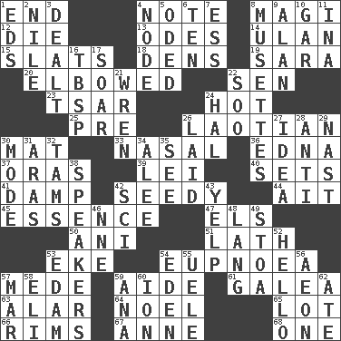ACROSS 1. Conclusion 4. Short letter 8. Wise men 12. Pass on 13. Lyric poems 14. ____ Bator 15. Narrow boards 18. Hiding places for outlaws 19. "Two Mules for Sister ____" 20. Shoved, as through a crowd 22. Elected rep. 23. Russian ruler of old 24. Being at a high temperature 25. Before (prefix) 26. Of or relating to Laos or its people 30. Floor covering 33. Relating to the nose 36. Pulitzer Prize-winning author Ferber 37. Mouths or openings 39. Flowery wreath 40. Arranges properly for use 41. Moist 42. Sleazy 44. Small island 45. Core 47. Raised railways 50. Black tropical American cuckoo 51. Thin strip of wood or metal 53. Supplement with great effort 54. Normal relaxed breathing 57. Ancient Persian 59. Helper 61. An organ shaped like a helmet 63. Having or resembling wings 64. Christmas carol 65. Car dealer's back yard 66. Basketball hoops 67. Singer Murray 68. Single DOWN 1. Begley and Asner 2. Mediterranean tributary 3. Started a card game 4. Thickened enlargement 5. Wrote a lyric poem 6. Nine, plus one 7. Double-curved letter 8. French bagpipes 9. Actor Alda or Thicke 10. Slender fish 11. _ tizzy (2 wds.) 16. Cook's measure (abbr.) 17. Fly high 21. Songbird 22. "Barney Miller" actor Jack 24. Actor Linden 26. Put down 27. The main thing one is thinking about 28. Opposed to 29. Political cartoonist Thomas 30. Method 31. Caspian sea tributary 32. Scottish caps 34. Toward shelter 35. Observe 38. Orators 42. _-fi 43. Sharp bark 46. Compass dir. 48. Long (Scottish) 49. Portico 52. Phone greeting 53. Dutch treat 54. Locale of original sin 55. Ubangi River tributary 56. A really long time 57. Third mo. 58. Connecticut Ivy Leaguer 59. Santa ___, CA 60. Electrically charged atom 62. Had dinner