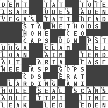 ACROSS 1. Incision 5. Make lace 8. Carryall 12. Austrian river, tributary to the Danube 13. Lyric poems 15. Arabian gulf 16. Viva Las _ 18. Jacques of French films 19. Necklace unit 20. R.R. building 22. Modes 24. Residence 26. Corporate head (abbr.) 27. Balmoral and tarboosh 28. Spanish title 29. Pacific Standard Time (abbr.) 32. Capital and largest city of Mongolia 35. Burrowing marine mollusk 37. Flowery wreath 38. Grant temporary use of 39. Direct toward a target or goal 40. Look after 41. The first octave above the treble staff 42. Roberta Peters solo 43. Relaxation 44. Born 45. Cleo's killer 46. Republicans 49. Music discs 50. Part of Q.E.F. 51. Preparing or cooking with lard 55. Black tropical American cuckoo 56. Hollow 57. Lick closed 59. Fraudulent business schemes 63. Competent 64. Native american tent (variation) 65. Welles in "The Third Man" 66. Path through which fluid escapes 67. Directed 68. Locale of original sin DOWN 1. HTML Container Element 2. Compass dir. 3. Tired old horse 4. File 13 5. Small child 6. First of billions? 7. False hair 8. Off limits 9. Wrote a lyric poem 10. Beverages made from leaves 11. Conclusion 14. "Cheers" or "Ellen" 17. Portico 21. Electrical Unit 23. Layer 25. Fortification 28. Break 29. Entreaty 30. Elected reps. 31. Event that recurs at intervals 32. ____ Bator, Mongolia 33. Hero or heavy, e.g. 34. Yard entry 36. Cards in a Roman deck? 40. One of the two male reproductive glands 42. Aid 45. Say or write further 47. Mouth or opening 48. Zero-star reviews 49. Small stream 51. Ear part 52. Silent film actress Nazimova 53. Famous astronaut Armstrong 54. Stare wonderingly 56. Actor Linden 58. Hat (slang) 60. Assist 61. Madame (abbr.) 62. Elected rep.