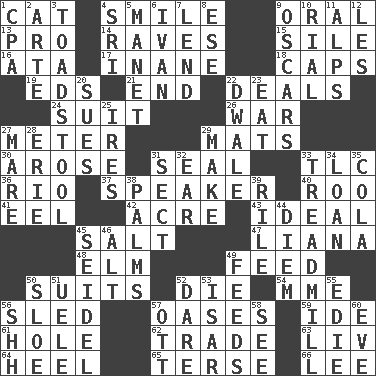 ACROSS 1. Domesticated feline 4. Grin 9. Relating to the mouth 13. Adept person 14. All-night dance parties 15. Drop; flow; fall 16. "One Day ___ Time" 17. Lacking in sense or substance 18. Balmoral and tarboosh 19. Begley and Asner 21. Conclude 22. Allots cards 24. Set of matching outer garments 26. Armed conflict 27. Distance measurement 29. Floor coverings 30. Came up 31. Lick closed 33. Affectionate concern, for short 36. River (Sp.) 37. Orator 40. Friend of Pooh 41. Snakelike fish 42. 43,560 square feet 43. Perfect 45. Table seasoning 47. Climbing, woody, usually tropical vines 48. Shade tree 49. Nourish 50. Sets or collections 52. Expire 54. Madame (abbr.) 56. Downhill vehicle 57. Fertile tracts in a desert 59. Binary compound 61. Opening into or through something 62. Buy and sell 63. 54 in ancient Rome 64. Person who is morally reprehensible 65. Laconic 66. Area sheltered from the wind DOWN 1. Numbers guy (abbr.) 2. Johnson of "Laugh-In" 3. Inedible or poisonous agaric 4. Indian title of respect (Mr.) 5. French painter Edouard 6. "Terrible" tsar 7. Grant temporary use of 8. Compass dir. 9. Motion picture awards 10. Monetary unit of Yemen 11. High mountains 12. French article 20. Takes to court 22. A sleeping potion; an opiate (poet.) 23. Erode 25. Angers 27. Female horse 28. One of the Great Lakes 29. Create 31. Religious group 32. Ewer handle 33. Excercise machine 34. Grant temporary use of 35. Root beer relative 38. Insides of hands 39. Cause heat under the collar 44. South Vietnam president (1954) 45. Beer mug 46. The first octave above the treble staff 49. Eats 50. _ gin 51. Ubangi River tributary 52. Have the gumption 53. Austrian river, tributary to the Danube 55. Singer Brickell 56. Quiet! 57. Baseball player Mel 58. Observe 60. First lady