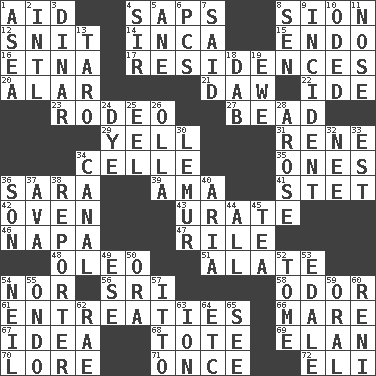 ACROSS 1. Help 4. Plant excrements 8. The Jewish people; Israel 12. In a ____ (agitated or irritated) 14. South American Indian 15. Inside; within (prefix) 16. Inactive volcano in Sicily 17. Homes 20. Having or resembling wings 21. Obsolete 22. Binary compound 23. Cowboy competition 27. Necklace unit 29. Shout 31. French philosopher Descartes 34. Cell (Danish) 35. Washington bills 36. "Two Mules for Sister ____" 39. Housemaid (var.) 41. Proofreading order 42. Baking chamber 43. A salt of uric acid 46. California wine valley 47. Cause heat under the collar 48. Butter sub 51. Having winglike extensions 54. Not either 56. Indian title of respect (Mr.) 58. Scent 61. Pleas 66. Female horse 67. It may be bright or harebrained 68. Carryall 69. Liveliness 70. Old wives' tales, e.g. 71. At one time in the past 72. Biblical high priest DOWN 1. Toward the sea 2. International (abbr.) 3. Middle Eastern gold or silver currency 4. Title for a knight 5. One (Scot) 6. Personal Computers (abbr.) 7. Expressed in words 8. Elected rep. 9. Event 10. Wrote a lyric poem 11. Characteristic smell of wine 13. Pacific island yam 18. Small moist lump or mass 19. She-sheep 24. Color 25. Snakelike fish 26. Rounded earthenware pot or jar 28. Came up 30. Arboreal primate 32. Born 33. Eastern Standard Time (abbr.) 34. Lessep's creation 36. Male child 37. Actress Gardner 38. Newsperson 40. Operatic vocal solo 44. 100% 45. Beverage made from leaves 49. Compass dir. 50. Mouth or opening 52. Heavy book 53. Peak District village in England 54. Famous astronaut Armstrong 55. Southwest Nigerian state 57. "Tell ____ the Marines!" 59. Taken by mouth 60. Painter Guido (1575-1642) 62. Actress Charlotte 63. Electrically charged atom 64. And so on (abbr.) 65. Observe