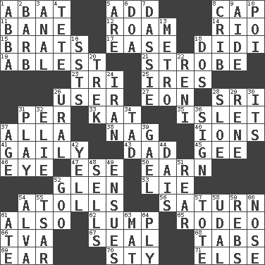 ACROSS 1. Blind as ____ 5. Increase 8. Head covering 11. Object of repulsion 12. Wander aimlessly 14. _ de Janeiro 15. Naughty children 17. Comfort 18. "You Light Up My Life" star Conn 19. Most capable 21. Disco prop 23. Three (prefix) 25. Angers 26. One who uses or employs something 27. A really long time 28. Indian title of respect (Mr.) 31. For each 33. Krazy ___ of comics 35. Small island 37. Silent film actress Nazimova 38. Tired old horse 40. Charged particles 41. Lightheartedly 43. June honoree 45. Turn to the right 46. Sight organ 47. Compass dir. 50. Merit 52. Small, secluded valley 53. Untruth 54. Ringlike coral islands and reefs 56. Titan orbits this 61. In addition 62. Mass 65. Cowboy competition 66. Federal power corp. 67. Lick closed 68. Bar bills 69. Ewer handle 70. Filthy place 71. Otherwise DOWN 1. Swedish rock group 2. Sharp remark 3. Of or related to the anus 4. Wig 5. "We ___ not amused" (Victoria) 6. ___ good deed 7. Hyrax 8. Baby bed with high sides 9. Assistant 10. Luau course 13. Paris' subway 16. Fast planes 18. Two (Sp.) 20. Long journey 22. Painter Guido (1575-1642) 24. SW Asia republic 26. Mountain range 28. A type of plum 29. French philosopher Descartes 30. ___ a Wonderful Life 31. Shaw product 32. Writer Wiesel 34. Small boy 36. Omen 37. Mature 39. Highlander 42. Shout 44. Raised platform 48. Makes a sale 49. Takes place subsequently 51. Hitchcock's "____ Window" 52. Thick or sticky substance 54. Inventor's middle name 55. Russian ruler of old 57. Lug 58. Allodial 59. Confederate soldiers (slang) 60. Olfactory organ 61. Had dinner 63. Floor protector 64. Travel a route regularly