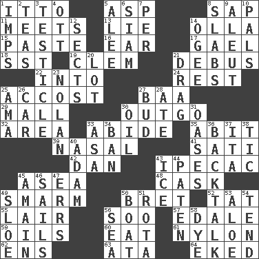 ACROSS 1. "Tell ____ the Marines!" 5. Viper 8. Plant excrement 11. Confronts 13. Whopper 14. Water jar 15. Thick mixture 16. Hearing organ 17. Highlander 18. Fast jet (abbr.) 19. To starve (Brit.) 21. To get out of a bus 22. To the inside or interior of 24. Repose 25. Buttonhole 27. Sound made by sheep 29. Shopping center 30. Money paid out 32. Type of rug 33. Tolerate 35. "This won't hurt ____!" 39. Relating to the nose 41. Suttee (variant) 42. Daniel's nick name 43. Medicinal drug used to evoke vomiting 45. At sea 48. Keg 49. Excessive but superficial compliments 50. Cy Young winner Saberhagen 52. Make lace 55. Den 56. "Barney Miller" actor Jack 57. Peak District village in England 59. Lubricates 60. Consume 61. Thermoplastic polyamide 62. Followers of ems 63. "One Day ___ Time" 64. Made supply last DOWN 1. Naughty children 2. Afternoon social gatherings 3. A testis 4. Baseball player Mel 5. Toward shelter 6. Thailand, formerly 7. For each 8. Broad, flat, thick pieces 9. Native American of Southwest Alaska 10. Friends 12. Religious groups 14. Double curve, resembling the letter S 20. Car dealer's back yard 21. To be drawn or hauled along 23. Pitcher Ryan 25. Nursemaid (var.) 26. 4-wheeled motor vehicle 27. Partially opened flower 28. Had dinner 30. Petroleum 31. Fertile tracts in a desert 33. White ___ sheet 34. Forbid 36. Sass 37. Call ___ day 38. Nervous spasm 40. First of billions? 43. Frozen water 44. Eucharist need 45. At full speed 46. Moves on water 47. Blunders 49. _ gin 50. Water vessel 51. Round or rotation of duties 53. Medicinal plant 54. Watch over 56. Ocean 58. Color