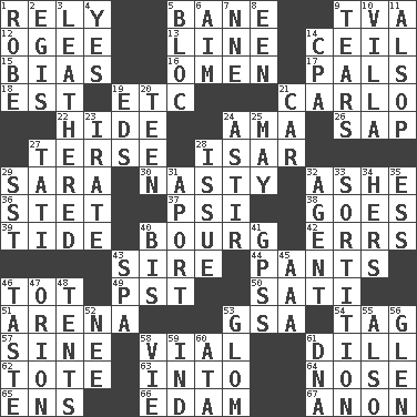 ACROSS 1. Have trust in 5. Object of repulsion 9. Federal power corp. 12. Double curve, resembling the letter S 13. Actor's bit 14. To provide with a ceiling 15. Prejudice 16. Sign of things to come 17. Friends 18. Eastern Standard Time (abbr.) 19. And so on (abbr.) 21. Monte _, Las Vegas Hotel/Casino 22. Flintstone garb 24. Nanny (var.) 26. Plant excrement 27. Laconic 28. Austrian river, tributary to the Danube 29. "Two Mules for Sister ____" 30. Difficult 32. American tennis player Robert 36. Proofreading order 37. 23rd letter of the Greek alphabet 38. Moves 39. Event that recurs at intervals 40. French market town 42. Blunders 43. Beget 44. Leg coverings 46. Small child 49. Pacific Standard Time (abbr.) 50. Suttee (variant) 51. Sports stadium 53. Girls' org. (abbr.) 54. Label 57. Trig term 58. Small bottle 61. Deli pickle 62. Lug 63. To the inside or interior of 64. Sense of smell 65. Followers of ems 66. Dutch treat 67. At once, immediately (arch.) DOWN 1. Loose flowing garment 2. Armor plate that protects the chest 3. Tough but pliablecoriaceous 4. It is so 5. Group of countries in special alliance 6. Direct toward a target or goal 7. Compass dir. 8. Car or cant ending 9. Rends 10. Country residence 11. Columnist Joseph or Stewart 14. Numbers guy (abbr.) 19. Begley and Asner 20. Adolescent 21. Automobile 23. Feeling or showing extreme anger 24. Moving about 25. Fifth month 27. Jacques of French films 28. Come out of 29. Fast jet (abbr.) 31. To the left, to Queeg 32. Representative 33. Determination 34. Possessive pronoun 35. Curvy letter 40. Twice 41. Global Positioning Systems (abbr.) 43. Health resort 45. American Automobile Association (abbr.) 46. Clothes sense 47. Constellation of myth 48. Portable shelters 52. Born 53. Take by theft 55. In addition 56. Small, secluded valley 58. Compete 59. Working for oneself (abbr.) 60. "One Day ___ Time" 61. Heredity factor (abbr.)