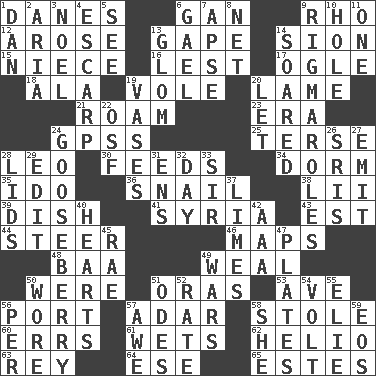 ACROSS 1. Natives or inhabitants of Denmark 6. Separate the seeds from cotton 9. 17th letter of the Greek alphabet 12. Came up 13. Stare wonderingly 14. The Jewish people; Israel 15. Sibling's daughter 16. For fear that 17. Stare at amorously 18. Insect wing 19. Grand slam 20. Unable to walk 21. Wander 23. Epoch 24. Global Positioning Systems (abbr.) 25. Laconic 28. Lion 30. Gives food to 34. Dormintory (informal) 35. Wedding promise 36. Slow-paced one 38. Cards in a Roman deck? 39. Food container 41. Damascus' land 43. Eastern Standard Time (abbr.) 44. Guide 46. Atlas contents 48. Sound made by sheep 49. Welt 50. Past tense of be (plural) 51. Mouths or openings 53. "___ Maria" 56. Sweet dark-red dessert wine 57. The sixth month of the Jewish calendar 58. Fur scarf 60. Blunders 61. Soaks 62. Sun: prefix 63. Marina Del _, California 64. Compass dir. 65. _____ Park, CO DOWN 1. Daniel's nick name 2. Operatic vocal solo 3. Christmas carol 4. Fortification 5. Perceive with the eye 6. Highlander 7. Domed church section 8. Fish or hair follower 9. Complicated, petty procedures 10. Opening into or through something 11. Single 13. Take by theft 14. Flew 19. Flower holders 20. Allow 22. Order of Saint Francis (abbr.) 24. Sour, prickly fruit 26. Indian titles of respect 27. Send forth 28. Hats (slang) 29. Prepare for publication 31. Followers of ems 32. 24 hours 33. Title for a knight 37. Citrus fruits 40. Centers of feelings and intuitions 42. Auto club (abbr.) 45. Actress Charlotte 47. Food holders 49. Armed conflicts 50. Had on 51. Lyric poems 52. Pace 54. Electrical Unit 55. Writer Wiesel 56. For each 57. Deep reverence 58. A female animal or person 59. Greek goddess of the dawn