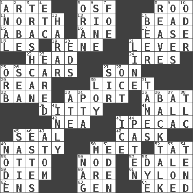 ACROSS 1. Johnson of "Laugh-In" 5. Order of Saint Francis (abbr.) 8. Friend of Pooh 11. Compass direction 13. _ de Janeiro 14. Necklace unit 15. Phillipine bananalike plant 16. One (Scot) 17. Comfort 18. French article 19. French philosopher Descartes 21. Prying instrument 22. Froth on beer 24. Angers 25. Motion picture awards 27. Boy, to dad 29. Hitchcock's "____ Window" 30. It is permitted: Lat. 32. Object of repulsion 33. To the left, to Queeg 35. Blind as ____ 39. Short, simple song 41. Promenade 42. Teachers' org. 43. Medicinal drug used to evoke vomiting 45. Lick closed 48. Keg 49. Offensive 50. Rendezvous 52. Make lace 55. Von Bismarck 56. Allow head to fall sleepily 57. Peak District village in England 59. South Vietnam president (1954) 60. "We ___ not amused" (Victoria) 61. Thermoplastic polyamide 62. Followers of ems 63. Commissioned mil. rank 64. Supplemented with great effort DOWN 1. Of or related to the anus 2. Loose flowing garment 3. File 13 4. And so on (abbr.) 5. Northwest Algerian city 6. Trig term 7. Enemy 8. Break or tear apart 9. Fertile tracts in a desert 10. River in Europe 12. Ethiopian city, capital of Harari 14. Fermented drink made from hops 20. Begley and Asner 21. Actor's bit 23. Having ears or earlike features 25. Globe 26. Ocean 27. Title for a knight 28. Sep. follower 30. Myrna of the movies 31. Domesticates 33. Had dinner 34. Parent Teacher Assoc. 36. Sass 37. According to 38. Affectionate concern, for short 40. Inwardly 43. Frozen water 44. Eucharist need 45. Smooth fabric 46. _____ Park, CO 47. Tiny particle 49. Thickened enlargement 50. Greater amount 51. Paradise 53. Medicinal plant 54. Look after 56. Tired old horse 58. Color