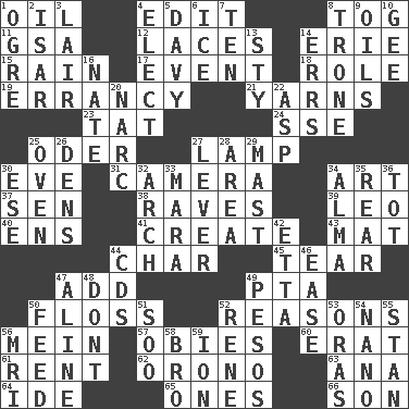ACROSS 1. Lubricate 4. Prepare for publication 8. Coat; cloak 11. Girls' org. (abbr.) 12. Shoestrings 14. 4th largest of the Great Lakes 15. Water falling in drops from the sky 17. Happening 18. Hero or heavy, e.g. 19. Tendancy to err 21. Tall tales 23. Make lace 24. Compass dir. 25. Baltic tributary 27. Desk light 30. Night before a holiday 31. Device for capturing images 34. Nonscientific branch of learning 37. Elected rep. 38. All-night dance parties 39. Lion 40. Followers of ems 41. Cause to be 43. Floor protector 44. Burn to charcoal 45. Pull into pieces 47. Find the sum of 49. Parent Teacher Association (abbr.) 50. Soft thread for cleaning between teeth 52. Thinks logically 56. Chow _ 57. Off-Broadway awards 60. Part of Q.E.F. 61. Monthly bill 62. U. of Maine site 63. Santa ___, CA 64. Binary compound 65. Singles 66. Male offspring DOWN 1. Legendary monster 2. Austrian river, tributary to the Danube 3. Den 4. Choose 5. _ Jones' Locker 6. Frozen water 7. Nine, plus one 8. Heavy duty weighing machine 9. Lubricates 10. Turn to the right 13. Filthy place 14. Blunders 16. Nathan's nickname 20. Drug cop 22. Cleo's killer 25. Baking chamber 26. Lairs 27. Crowbar 28. Length times width 29. Vertical spar for supporting sails 30. Compass dir. 32. Bowlike part 33. Hindu Mythology: god of death 34. _ mater 35. Hitchcock's "____ Window" 36. Small child 42. Singer James 44. Music discs 46. Relaxation 47. Place in a line 48. Do not 49. Mexican monetary units 50. Nourish 51. "Barney Miller" actor Jack 52. French philosopher Descartes 53. Mouths or openings 54. Billionth: prefix 55. Comedian Laurel of Laurel & Hardy 56. Medical imaging device (abbr.) 58. Sis' sibling 59. Electrically charged atom