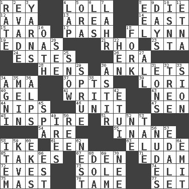 ACROSS 1. Marina Del _, California 4. Hang loosely or laxly 8. Singer Brickell 12. Actress Gardner 13. Length times width 14. Compass direction 15. Pacific island yam 17. Romantic infatuation 18. Film actor Errol 19. Ferber et al. 21. 17th letter of the Greek alphabet 23. R.R. building 24. _____ Park, CO 26. Period 28. Coop moms 30. Short socks 34. Housemaid (var.) 37. Elects 39. Australian parrot (variant) 40. Set 41. Compose 43. Modern: prefix 44. Cuts off 46. A single undivided whole 47. Elected rep. 48. Stimulate to action 51. Undersized animal 54. "We ___ not amused" (Victoria) 55. Silly 58. D.D.E's nickname 61. Car or cant ending 63. Dodge 65. Receives possession of 67. Genesis locale 71. Dutch treat 72. Nights before holidays 73. Not divided or shared with others 74. Biblical high priest 75. Vertical spar for supporting sails 76. Not wild 77. Arrange properly for use DOWN 1. Pace 2. Dodge 3. Entertaining tales 4. Pet locale 5. Mouth or opening 6. French article 7. Cowardly lion portrayer 8. Snakelike fish 9. 24-hour periods 10. Is not 11. Inactive volcano in Sicily 16. Pledge 18. Tined utensil 20. Perceive with the eye 22. Layer 25. Frozen precipitation 27. Everything 29. Upset 30. Moving about 31. Immeasurably long periods of time 32. Family _ (genealogy) 33. The Jewish people; Israel 34. Hindu god of fire 35. Chow _ 36. High mountains 38. Metal container 42. Needle holder 45. Health resort 49. Angers 50. To sift 52. Compass dir. 53. Lie 56. Unadorned figures 57. Peak District village in England 58. A distinct part 59. Polynesian shrub of the pepper family 60. Makes supply last 62. A home for chicks 64. Send forth 66. Eastern Standard Time (abbr.) 68. ___ good deed 69. Shade tree 70. Born
