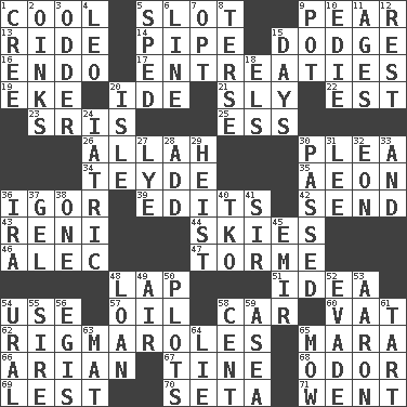 ACROSS 1. Calm and collected 5. Narrow opening 9. Lightbulb-shaped fruit 13. Travel on an animal 14. Corncob 15. Evade 16. Inside; within (prefix) 17. Pleas 19. Make supply last 20. Binary compound 21. Insidious 22. Eastern Standard Time (abbr.) 23. Indian titles of respect 25. Curvy letter 26. Assad's deity 30. Entreaty 34. Miss Universe 1986, Barbara Palacios _ 35. Age 36. Composer Stravinsky 39. Proofreads 42. Transmit 43. Painter Guido (1575-1642) 44. Atmospheres 46. Actor Baldwin 47. Singer Mel 48. Infant locale 51. The main thing one is thinking about 54. Purpose 57. Petroleum 58. 4-wheeled motor vehicle 60. Large container 62. Complicated, petty procedures 65. Hindu Mythology: god of death 66. Believer in; advocate of (suffix) 67. Prong on a fork 68. Scent 69. For fear that 70. Stalk of a moss capsule 71. Left DOWN 1. Algonquian 2. Pig sounds 3. More peculiar 4. Lion 5. Hurried 6. Actor's bit 7. Elect 8. Laconic 9. Plant holder 10. Singer Brickell 11. Eras 12. State of inaction 15. 24-hour periods 18. Raised railways 20. Small island 24. Of or pertaining to medicine 27. Sodium hydroxide 28. Say or write further 29. Robbery 30. Went by 31. Area sheltered from the wind 32. A really long time 33. Added to 36. Retirement account (abbr.) 37. Set 38. Single 40. Ring climax 41. Title for a knight 45. Independent ruler or chieftain 48. Grant temporary use of 49. Wind 50. Ground plans 52. Elude 53. Composer Copland 54. Mountain range 55. Father 56. The front part of a cuirass 58. Penny 59. At sea 61. Small pie 63. Floor covering 64. Falsehood 65. Cut the grass