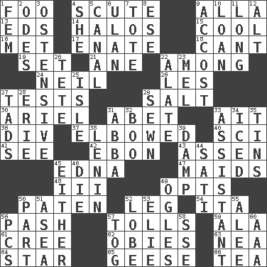 ACROSS 1. Egg _ yung 4. Scutum 9. Silent film actress Nazimova 13. Begley and Asner 14. Rings 15. Calm and collected 16. Was introduced to 17. Maternal 18. Patter 19. Put into a specified state 21. One (Scot) 22. Amid 24. Famous astronaut Armstrong 26. French article 27. Trials 29. Table seasoning 30. Satellite of Uranus 31. Collude with 33. Small island 36. HTML Container Element 37. Turned at an angle; bent 40. _-fi 41. Perceive with the eye 42. Inky black, to poets 43. NE Netherlands city 45. Pulitzer Prize-winning author Ferber 47. Unmarried girls 48. One more than two 49. Chooses 50. Eucharist need 52. Part of a journey 54. Call ___ day 56. Romantic infatuation 57. For Whom the Bell _____ 59. In the manner of 61. Algonquian 62. Off-Broadway awards 63. Teachers' org. 64. Play the lead 65. Honkers 66. Afternoon social gathering DOWN 1. Opposite of masc. 2. Lyric poems 3. Clearly or manifestly demonstrative 4. A female animal or person 5. Lessep's creation 6. ____ Bator 7. Lug 8. Compass dir. 9. Buttonhole 10. Grant temporary use of 11. Protracted 12. Keyboard modifier key 20. False hair 22. Having winglike extensions 23. Cartoonist voice _ Blanc 25. Capri or Wight 27. Small boys 28. 4th largest of the Great Lakes 29. Stitched 31. Swedish rock group 32. Surprise greeting 33. Helper 34. On the rocks 35. Airtight sealed metal containers 38. Soviet premier 1918-24 39. Moist 44. Suttee (variant) 45. One or the other of two 46. Pass on 49. Stares at amorously 50. Component 51. Toward the sea 52. Ear part 53. Writer Wiesel 55. Toward shelter 56. Personal Computers (abbr.) 57. Coat; cloak 58. Compass dir. 60. Auto club (abbr.)