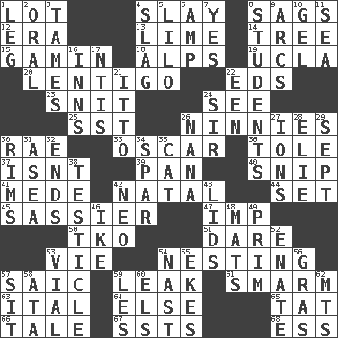 ACROSS 1. Car dealer's back yard 4. Kill 8. Sinks 12. Epoch 13. Welles in "The Third Man" 14. Family _ (genealogy) 15. Homeless child 18. High mountains 19. Southern CA. univ. 20. Small, flat, pigmented spot on the skin 22. Begley and Asner 23. In a ____ (agitated or irritated) 24. Perceive with the eye 25. Fast jet (abbr.) 26. Fools 30. Actress Charlotte 33. Motion picture award 36. Lacquered or enameled metalware 37. Is not 39. Baking dish 40. Clip 41. Ancient Persian 42. Brizilian seaport 44. Put into a specified state 45. More disrespectful 47. Naughty child 50. Ring climax 51. Have the gumption 53. Compete 54. Inhabiting a nest 57. Ketch in the Levant 59. Path through which fluid escapes 61. Excessive but superficial compliments 63. Slanted text style (abbr.) 64. Otherwise 65. Make lace 66. Lie 67. Fast planes 68. Double-curved letter DOWN 1. Part of a journey 2. Spoken 3. Softens 4. Volcanic refuse 5. _ and Stitch 6. Electrical Unit 7. Consenting reply 8. SAT takers 9. Curves 10. Set 11. Ocean 16. Restaurants 17. Nuclear Threat Initiatives 21. "Tell ____ the Marines!" 22. Car or cant ending 24. Title for a knight 26. Nanny 27. Charged atoms 28. Writer Wiesel 29. Back-to-school mo. 30. Basketball hoops 31. Toward the sea 32. Extremities 34. Practice fight 35. Feline 38. A testis 42. Modern: prefix 43. Hats (slang) 46. Mamie's mate 48. Floor protectors 49. Demure 52. Related on the mother's side 53. Small bottle 54. Political cartoonist Thomas 55. Supplements with great effort 56. Pate de foie ____ 57. Be seated 58. _ moment's notice (2 wds.) 59. French article 60. Raised railways 62. Mountains (abbr.)