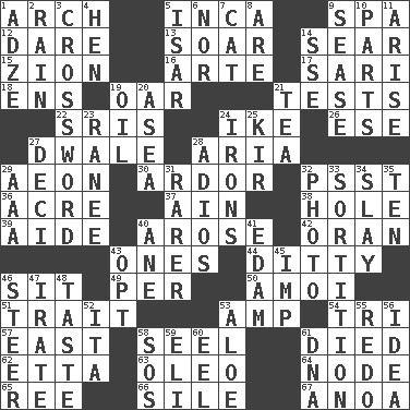 ACROSS 1. Bowlike part 5. South American Indian 9. Health resort 12. Have the gumption 13. Fly high 14. Singe 15. The Jewish people; Israel 16. Johnson of "Laugh-In" 17. Indian skirt 18. Followers of ems 19. Boat paddle 21. Trials 22. Indian titles of respect 24. Eisenhower's nickname 26. Compass dir. 27. A sleeping potion; an opiate (poet.) 28. Operatic vocal solo 29. Period of immesurable duration 30. Zeal 32. Inconspicuous attention getter 36. 43,560 square feet 37. The 18th letter of the Arabic alphabet 38. Opening into or through something 39. Helper 40. Came up 42. NW Algerian seaport 43. Washington bills 44. Short, simple song 46. Be seated 49. For each 50. Mine, in Marseilles 51. Distinguishing feature 53. Electrical Unit 54. Three (prefix) 57. 90 degrees 58. Sew up the eyelids of hawks and falcons 61. Passed on 62. Singer James 63. Butter sub 64. Thickened enlargement 65. To separate or throw off 66. Filth; sediment 67. Small Philippine buffalo DOWN 1. Edge tool used to cut and shape wood 2. Precipitation 3. What you're doing now 4. Layer 5. Austrian river, tributary to the Danube 6. And not 7. Domesticated feline 8. "We ___ not amused" (Victoria) 9. Gospel singer Marvin 10. Components 11. Ascend 14. Compass dir. 19. Petroleum 20. At sea 21. Beverage made from leaves 23. Indian princess (variant) 24. Metal shackles 25. Apertif with cassis 27. Tenth: prefix 28. Goodbye (Sp.) 29. American Automobile Association (abbr.) 31. More uncommon 32. Picture 33. Decision 34. Kill 35. Nine, plus one 40. A saturated hydrocarbon 41. Dutch treat 43. Elect 45. Mischievous child 46. Navigate 47. Feeling or showing extreme anger 48. Clothes sense 52. Call ___ day 53. _ vera 55. Make new 56. The main thing one is thinking about 58. Mayday 59. Biblical high priest 60. Snakelike fish 61. Heredity factor (abbr.)