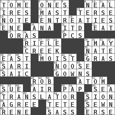 ACROSS 1. Heavy book 5. Singles 9. Actress Patricia 13. Angers 14. Vertical spar for supporting sails 15. Laconic 16. Short letter 17. Pleas 19. Compass dir. 20. Santa ___, CA 21. It would 22. Ingest 23. Mouths or openings 25. Personal Computers (abbr.) 26. Firearm 30. "If ____ say so..." 34. Small stream 35. Nathan's nickname 36. 90 degrees 39. Wet 42. Pate de foie ____ 43. Indian skirt 44. Trap for birds or small mammals 46. Ketch in the Levant 47. Long dresses 48. Director Reiner 51. Tiny particle 54. Take to court 57. Wind 58. Infant food 60. Ocean 62. Interpreter 65. The Jewish people; Israel 66. Match 67. Wig 68. Stitched 69. French philosopher Descartes 70. Backtalk 71. Celtic language DOWN 1. Prong on a fork 2. U. of Maine site 3. Distance measurement 4. Compass dir. 5. Sign of something about to happen 6. Grandmother 7. Eastern Standard Time (abbr.) 8. Empty completely 9. Fish or hair follower 10. One of the Great Lakes 11. At sea 12. For fear that 15. Bits 18. And so on (abbr.) 20. SW Saudi Arabia district 24. Northern region 27. Opposite of masc. 28. Lion 29. Supplementing with great effort 30. Consume 31. Third mo. 32. _ moment's notice (2 wds.) 33. It is so 36. Curvy letter 37. Auto club (abbr.) 38. _ Lanka 40. "Barney Miller" actor Jack 41. Pull behind 45. Fastener 48. To erase 49. Lubricate 50. Naughty children 52. Flexible twig of a willow tree 53. Catcalls? 54. Play the lead 55. Goad 56. Merit 58. Plant holders 59. Ancient Greek god of war 61. Queen of England 1702-14 63. Born 64. Afternoon social gathering 65. Compass dir.