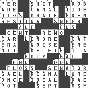 ACROSS 1. For each 4. Stricken, poetically 8. Director Reiner 11. "We ___ not amused" (Victoria) 12. Lessep's creation 14. Periodic rise and fall of the sea level 15. "Vaya con ____" 17. Declaim 18. Locale of original sin 19. French poetic form 21. Contemptuous expression 23. A saturated hydrocarbon 24. Followers of ems 25. Penny 27. San ____ (Riviera town) 30. 4-wheeled motor vehicle 31. Poe poem 34. Feline 37. Epoch 38. Annoying sound 39. Compass dir. 40. Baseball player Mel 41. Erase 43. Call ___ day 44. Many (prefix) 45. Indonesian resort city 47. Australian flightless bird 49. Spanish title 50. Soft thread for cleaning between teeth 52. Elected representative 56. Highlander 57. Canadian anthropologist Darnell 60. Old wives' tales, e.g. 61. Single time 62. Perfect 63. Actress Charlotte 64. Plant holder 65. Back-to-school mo. 66. Order of Saint Francis (abbr.) DOWN 1. Writing tablets 2. One of the Great Lakes 3. Vintage cars 4. Biscuitlike quick bread 5. Hindu Mythology: god of death 6. _ tizzy (2 wds.) 7. Make lace 8. Amusement-park features 9. Baltic tributary 10. Benjamin's nick name 13. French article 14. Adolescent 16. Comedian Laurel of Laurel & Hardy 20. International (abbr.) 22. Modern: prefix 25. Heavy open wagon 26. Part of Q.E.F. 27. Turbulent 28. Celtic language 29. Rendezvous 30. Corporate head (abbr.) 32. Inside; within (prefix) 33. Christmas carol 34. To provide with a ceiling 35. Against 36. Afternoon social gathering 42. Inky black, to poets 44. Festering 46. Of or related to the anus 47. Voters do this 48. Undercover agent 49. Started a card game 50. Papal veil 51. Indian title of respect (Mr.) 52. Fastener 53. "Corrida" creature 54. Mouths or openings 55. Coral ridge 56. Republican Party 58. Begley and Asner 59. Turn to the right