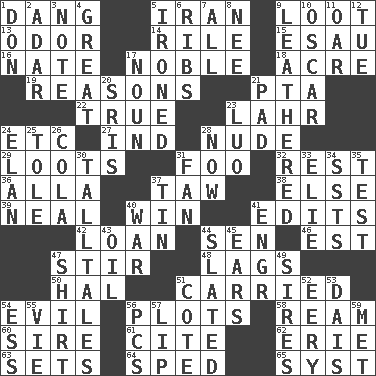 ACROSS 1. Mild oath, euphamism for damn 5. SW Asia republic 9. Spoils 13. Aroma 14. Cause heat under the collar 15. Son of Isaac 16. Nathan's nickname 17. Impressive in appearance 18. 43,560 square feet 19. Thinks logically 21. Parent Teacher Assoc. 22. Loyal 23. Cowardly lion portrayer 24. And so on (abbr.) 27. Working for oneself (abbr.) 28. Naked 29. Plunders 31. Egg _ yung 32. Remainder 36. Silent film actress Nazimova 37. The 23rd letter of the Hebrew alphabet 38. Otherwise 39. Be tempered by heat 40. Acquire through effort 41. Prepares for publication 42. Grant temporary use of 44. Elected rep. 46. Eastern Standard Time (abbr.) 47. Move through with a circular motion 48. Fails to keep up a pace 50. Actor Linden 51. Borne 54. Morally bad or wrong 56. Schemes 58. 480, 500 or 516 sheets of paper 60. Title for a man of rank and authority 61. Quote 62. 4th largest of the Great Lakes 63. Arranges properly for use 64. Moved rapidly 65. System (abbr.) DOWN 1. Spanish title 2. The sixth month of the Jewish calendar 3. Musical sound 4. Relatively large 5. Pressed 6. Teases 7. 100% 8. Born 9. Tough but pliablecoriaceous 10. Motion picture award 11. Rowing implement 12. Third day of the wk. 17. Part of speech 20. Indian titles of respect 21. Writing tablet 23. Nilotic language 24. Flair 25. Lacquered or enameled metalware 26. Root beer relative 28. At this time 30. Baron Munchausen's specialties 31. Avid follower 33. Writer Wiesel 34. Fast planes 35. Trial 37. Metal container 40. Armed conflict 41. Engineer (abbr.) 43. Petroleum 44. Scheduled 45. Hearing organs 47. Upper-body garment 49. Fathers 51. ____ d'Azur (French Riviera) 52. Suggestive of the supernatural 53. Raised platform 54. Curvy letter 55. Compete 56. Personal Computers (abbr.) 57. Mouth edge 59. Was introduced to