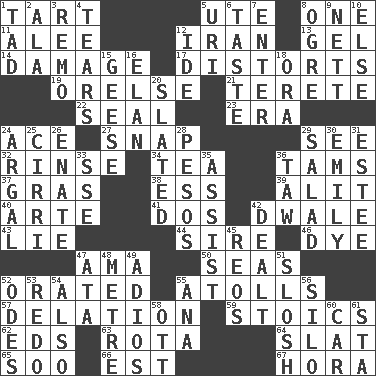 ACROSS 1. Small pie 5. Shoshoni 8. Single 11. Toward shelter 12. SW Asia republic 13. Set 14. Break 17. What propaganda does 19. Threatening words 21. Cylindrical with tapered ends 22. Lick closed 23. Period 24. Adept person 27. Fastener 29. Perceive with the eye 32. Remove soap 34. Beverage made from leaves 36. Scottish caps 37. Pate de foie ____ 38. Double-curved letter 39. Set down 40. Johnson of "Laugh-In" 41. Two (Sp.) 42. A sleeping potion; an opiate (poet.) 43. Whopper 44. Father 46. Color 47. Nursemaid (var.) 50. Oceans 52. Spoke pompously 55. Ringlike coral islands and reefs 57. Conveyance 59. Unemotional ones 62. Begley and Asner 63. Roll call or roster of names 64. Narrow board 65. "Barney Miller" actor Jack 66. Eastern Standard Time (abbr.) 67. Israeli folk dance DOWN 1. Small boy 2. Wing 3. San ____ (Riviera town) 4. Rends 5. RI univ. 6. Clothes sense 7. Keyboard key 8. Legendary monster 9. Remaining after all deductions 10. Otherwise 12. Binary compound 15. Honkers 16. Liveliness 18. Mouth or opening 20. Scheduled 24. Therefore, facetiously 25. High-altitude cloud 26. Maternal 28. Mexican monetary units 29. First course 30. Poet Dickinson 31. First name in cosmetics 33. Compass dir. 35. Help 36. The 23rd letter of the Hebrew alphabet 42. Started a card game 45. Vintage cars 47. _ moment's notice (2 wds.) 48. Distance measurement (Brit.) 49. Goodbye (Sp.) 51. Agitate, as a liquid 52. Lyric poems 53. Redecorate 54. In addition 55. Santa ___, CA 56. Grain storage tower 58. Baseball player Mel 60. Automobile 61. R.R. building