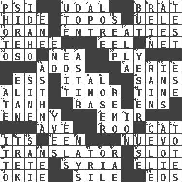ACROSS 1. 23rd letter of the Greek alphabet 4. Allodial 8. Naughty child 12. Flintstone garb 14. Literary convention 16. Ubangi River tributary 17. NW Algerian seaport 18. Pleas 20. Giggle 22. Snakelike fish 23. Fish or hair follower 24. Bear (Spanish) 25. Teachers' org. 28. Apply oneself diligently 30. Does sums 31. Nest on high 35. Double-curved letter 37. Slanted text style (abbr.) 40. Without 41. Set down 42. Southeast Indonesia island 44. Prong on a fork 45. Hyperbolic tangent 46. Raze (variant) 47. Followers of ems 48. Foe 50. Independent ruler or chieftain 52. "___ Maria" 54. Friend of Pooh 55. Domesticated feline 58. ___ a Wonderful Life 61. Car or cant ending 63. New (sp.) 65. Interpreter 70. Position in a hierarchy or organization 71. Wig 72. Damascus' land 73. Writer Wiesel 74. Migrant worker of the '30s 75. Drop; flow; fall 76. Begley and Asner DOWN 1. Picture 2. Founders of families 3. Potato state 4. Shoshoni 5. Spanish title 6. Fitting 7. Old wives' tales, e.g. 8. With the exception that 9. It's straight from the horse's mouth 10. Toward shelter 11. Trial 13. Compass dir. 15. Ooze 19. Silent film actress Nazimova 21. Conclusion 26. Prepare for publication 27. Moving or stirring 29. Last 30. Respiratory problem 32. Water falling in drops from the sky 33. Lodging establishments 34. Compass dir. 35. Style 36. Trig term 38. Wet nurse (var.) 39. Failure 41. Had dinner 43. San ____ (Riviera town) 49. Jacques Cousteau's middle name 51. Electrically charged atom 53. Snakelike fish 55. Cell (Danish) 56. Prevent from happening 57. Lugs 58. "Tell ____ the Marines!" 59. Long journey 60. Suttee (variant) 62. Negative votes 64. Purpose 66. Born 67. Three (prefix) 68. Lubricate 69. Actress Charlotte