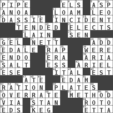 ACROSS 1. Corncob 5. Raised railways 8. Cleo's killer 11. Small Philippine buffalo 12. Rich soil 13. Lion 14. Small ungulate mammals of Africa 17. Happening 19. Watched over 21. Opts 22. (Had) reclined 23. Elected rep. 24. Set 27. Remaining after all deductions 29. Say or write further 32. Peak District village in England 34. Hit sharply and swiftly 36. Past tense of be (plural) 37. Inside; within (prefix) 38. Epoch 39. Roberta Peters solo 40. Table seasoning 41. Double-curved letter 42. Satellite of Uranus 43. Compass dir. 44. Slanted text style (abbr.) 46. Eastern Standard Time (abbr.) 47. Had dinner 50. Dutch treat 52. Food allowance for one day 55. Food holders 57. Make much ado about nothing 59. Mode 62. By way of 63. Comedian Laurel of Laurel & Hardy 64. Printing process, for short 65. Begley and Asner 66. Cask 67. Singer James DOWN 1. Groovy apt. 2. _ tizzy (2 wds.) 3. Mail 4. Artist's stand 5. Age 6. Shoestrings 7. Grin 8. Actor Baldwin 9. Transmitted 10. Plant holders 12. Hat (slang) 15. Silly 16. Singer Brickell 18. Lair 20. Main course 24. Honkers 25. Ferber et al. 26. Dipping utensil 28. Tarsus (plural) 29. Nest on high 30. Frees from moisture 31. Started a card game 33. Car dealer's back yard 35. Soft color 36. Armed conflict 42. Having winglike extensions 45. First of billions? 47. Atmosphere 48. Cod relative 49. Related on the mother's side 51. Distance measurement (Brit.) 52. Be footloose 53. Enthusiastic 54. Beverages made from leaves 55. Animal enclosure 56. Opportunity 58. Label 60. Baseball player Mel 61. ___ good deed