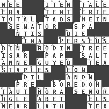 ACROSS 1. Born 4. A whole individual unit 8. Falsehood 12. Period 13. Portable shelter 14. One of the Great Lakes 15. "_____ Recall" 18. Bits 19. Chow _ 20. Legislator 22. Health resort 23. Nuclear Threat Initiatives 24. Expire 25. _ tizzy (2 wds.) 26. Son of Zeus who helped slay Medusa 30. Storage container 33. "The Thinker" sculptor 36. Relationship diagram 37. Austrian river, tributary to the Danube 39. Infant food 40. Table seasoning 41. Queen of England 1702-14 42. Steadied 44. Afternoon social gathering 45. Paper fasteners 47. A really long time 50. Petroleum 51. At once, immediately (arch.) 53. Before (prefix) 54. Mood resulting from idleness 57. Pulled tight 59. Israeli folk dance 61. Sir (Sp.) 63. Stare at amorously 64. Collude with 65. Raised railways 66. Put on (as clothing) 67. Thin strip of wood or metal 68. John Ritter's dad DOWN 1. Fish or hair follower 2. Greek god of love 3. Eroded 4. "Tell ____ the Marines!" 5. Rend 6. Conclude 7. Mountains (abbr.) 8. Storms 9. Type of rug 10. Cards in a Roman deck? 11. Car or cant ending 16. Opposed to 17. (Had) reclined 21. Russian ruler of old 22. Title for a knight 24. Lair 26. Corncob 27. Part of Q.E.F. 28. Ubangi River tributary 29. Bristle 30. Prejudice 31. Is not 32. Nanny 34. Musical composition 35. 24 hours 38. News announcer 42. Set 43. Letter starter 46. Untruth 48. Singles 49. Connecting point 52. Music written for nine 53. Monetary unit of Botswana 54. Cy Young winner Saberhagen 55. Pledge 56. Undercover agent 57. Pull behind 58. Personal question 59. Actor Linden 60. Chief or king in Benin or Nigeria 62. Acura sports coupe