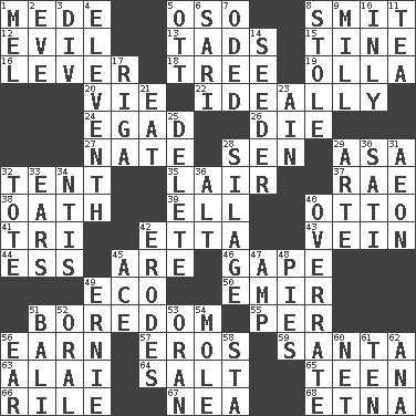 ACROSS 1. Ancient Persian 5. Bear (Spanish) 8. Stricken, poetically 12. Tending to cause great harm 13. Small amounts or degrees 15. Prong on a fork 16. Prying instrument 18. Family _ (genealogy) 19. Rounded earthenware pot or jar 20. Compete 22. Under perfect conditions 24. Mild oath 26. Pass on 27. Nathan's nickname 28. Elected rep. 29. White ___ sheet 32. Portable shelter 35. Den 37. Actress Charlotte 38. Pledge 39. Pipe bend 40. "Beetle Bailey" pooch 41. Three (prefix) 42. Singer James 43. Distinctive style or manner 44. Double-curved letter 45. "We ___ not amused" (Victoria) 46. Stare wonderingly 49. Environmental prefix 50. Arab leader 51. Mood resulting from idleness 55. For each 56. Merit 57. Greek god of love 59. Before Barbara or Clara 63. Mountain range southwest of Kyrgyzstan 64. Table seasoning 65. Adolescent 66. Cause heat under the collar 67. Teachers' org. 68. Inactive volcano in Sicily DOWN 1. Cartoonist voice _ Blanc 2. First lady 3. HTML Container Element 4. Veterans Day date 5. Baseball player Mel 6. Indian skirt 7. Wrote a lyric poem 8. Fur scarf 9. Place where flour is made 10. In an inward manner 11. Afternoon social gathering 14. Sowing specialist 17. Capital of Latvia 21. Erode 23. The 18th letter of the Arabic alphabet 25. Keyboard key 28. Fodder prepared in a silo 29. Johnson of "Laugh-In" 30. Suttee (variant) 31. Period of immesurable duration 32. Carryall 33. Hearing organs 34. Nuclear Threat Initiatives 36. The first octave above the treble staff 40. Make much ado about nothing 42. Eats (away) 45. Adept person 47. Electrical Unit 48. Sliced desserts 49. Bert's buddy 51. Indonesian resort city 52. Taken by mouth 53. Northwest Algerian city 54. Undercover agent 56. Ewer handle 58. R.R. building 60. Fish or hair follower 61. Nine, plus one 62. Santa ___, CA
