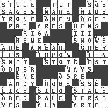 ACROSS 1. Vertical member of a panel or frame 6. Teat (slang) 9. Mayday 12. Gurus 13. Female horse 14. Flintstone garb 15. Heavy duty weighing machine 16. So be it 17. Double curve, resembling the letter S 18. Adept person 19. Ancient Greek god of war 20. Coop moms 21. Capital of Latvia 23. One more than two 24. French philosopher Descartes 25. Overwhelms 28. "We ___ not amused" (Victoria) 30. Approach 34. Jennifer or Joel 35. French article 36. Literary convention 38. It is 39. In a ____ (agitated or irritated) 41. Unemotional 43. Eastern Standard Time (abbr.) 44. More peculiar 46. Negative votes 48. Compass dir. 49. Legendary monster 50. Actor Griffith 51. Loose flowing garment 53. Compass dir. 56. Louse (plural) 57. Grain storage tower 58. Having lost freshness 60. Wrote a lyric poem 61. Light colored 62. Laconic 63. Affirmative reply 64. Wing 65. Satellite of Uranus DOWN 1. Fast jet (abbr.) 2. Canvas cover 3. Composer Stravinsky 4. Poe poem 5. Compass dir. 6. Not wild 7. Angers 8. Nine, plus one 9. Seigniories (variant) 10. Lyric poems 11. Perceive with the eye 13. Hindu Mythology: god of death 14. Weeding 19. Representative 20. Part of HMS, perhaps 22. _ tizzy (2 wds.) 24. Homes 26. Moistens 27. System (abbr.) 28. In addition 29. Tear apart 31. Greek goddess of the dawn 32. Fitting 33. Friend of Pooh 37. Burn superficially 40. Watched over 42. Auto 45. Marina Del _, California 47. Of or pertaining to yesterday 49. Mitch Miller's instrument 50. Assistant 51. Monetary unit of Yemen 52. Rounded earthenware pot or jar 54. Indian skirt 55. Otherwise 56. Myrna of the movies 57. Health resort 58. R.R. building 59. Snakelike fish