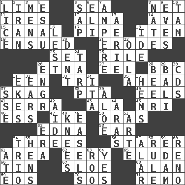 ACROSS 1. Welles in "The Third Man" 5. Ocean 8. Fish or hair follower 11. Angers 12. _ mater 14. Actress Gardner 15. Lessep's creation 17. Corncob 18. A distinct part 19. Took place subsequently 21. Eats (away) 23. Arrange properly for use 25. Cause heat under the collar 26. Inactive volcano in Sicily 27. Snakelike fish 28. English channel? 31. Car or cant ending 33. Three (prefix) 35. Having the leading position 37. Heroin 38. Parent Teacher Assoc. 40. Snakelike fish 41. Father Junipero _ 43. Chicken ___ king 45. Medical imaging device (abbr.) 46. Double-curved letter 47. Mamie's mate 50. Mouths or openings 52. Pulitzer Prize-winning author Ferber 53. Ewer handle 54. Threesomes 56. A viewer who gazes fixedly 61. Type of rug 62. Suggestive of the supernatural 65. Evade 66. Metal container 67. A type of plum 68. Actor Alda or Thicke 69. Greek goddess of the dawn 70. Mayday 71. San ____ (Riviera town) DOWN 1. Louse (plural) 2. SW Asia republic 3. Not women's 4. Son of Isaac 5. Plant excrement 6. Biblical high priest 7. Electrical Unit 8. Nathan's nickname 9. Nights before holidays 10. Scottish cap 13. Nest on high 16. For fear that 18. Binary compound 20. Incision 22. Rounded earthenware pot or jar 24. Canvas cover 26. Engineer (abbr.) 28. Fermented drink made from hops 29. Indonesian resort city 30. Music discs 31. Supplements with great effort 32. Hearing organs 34. Call ___ day 36. Cloth borders 37. Compass dir. 39. _ vera 42. Helper 44. Ancient river in northeast Turkey 48. Leg joints 49. Artist's stands 51. Johnson of "Laugh-In" 52. Epoch 54. Musical group of three 55. Coop moms 57. Having or resembling wings 58. Governing power 59. Dutch treat 60. Former U.S. Attorney General Janet 61. Had dinner 63. Friend of Pooh 64. Consenting reply