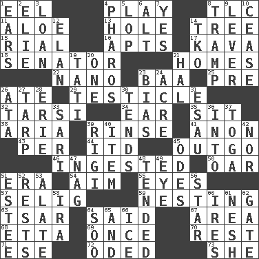 ACROSS 1. Snakelike fish 4. Live dramatic performance 8. Affectionate concern, for short 11. _ vera 13. Opening into or through something 14. Relationship diagram 15. Monetary unit of Yemen 16. Flats, for short 17. Polynesian shrub of the pepper family 18. Legislator 21. Residences 22. Billionth: prefix 23. Sound made by sheep 25. Before (prefix) 26. Had dinner 29. A testis 32. Tarsus (plural) 34. Hearing organ 35. Be seated 38. Roberta Peters solo 39. Wash lightly 41. Soon (poet.) 43. For each 44. It would 45. Expenditure 46. Swallowed 50. Rowing implement 51. Epoch 54. Direct toward a target or goal 55. Sight organs 57. Major League Baseball Commissioner Bud 59. Inhabiting a nest 63. Russian ruler of old 64. Alleged 67. Type of rug 68. Singer James 69. At one time in the past 70. Take ten 71. Compass dir. 72. Wrote a lyric poem 73. A female animal or person DOWN 1. Hearing organs 2. Writer Wiesel 3. Grant temporary use of 4. N Egypt peninsula 5. Chop off 6. The first octave above the treble staff 7. Consenting reply 8. _____ steamer (cargo ship) 9. Crowbar 10. Stop 12. Enthusiasm 14. Ring climax 19. Jacques of French films 20. Single 21. Actor Linden 23. Prejudice 24. Land measure 26. _ moment's notice (2 wds.) 27. Canvas cover 28. One of the Great Lakes 30. Looks after 31. Son of Isaac 33. Indian skirt 36. To the inside or interior of 37. Ancient Roman robe 39. Swiss mountan, "Queen of the Mountains" 40. A whole individual unit 42. Or not 45. Lyric poems 47. Tired old horse 48. Watched over 49. Sight organ 51. First name in cosmetics 52. Musical pauses 53. Having winglike extensions 56. Play the lead 58. Retirement account (abbr.) 60. Angers 61. Delicate 62. Yard entry 64. "Barney Miller" actor Jack 65. Also 66. Frozen water