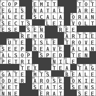 ACROSS 1. Police officer (slang) 4. Send forth 8. Small child 11. The front part of a cuirass 13. Brizilian seaport 15. "We ___ not amused" (Victoria) 16. Toward shelter 17. Any of the three canals of the cochlea 18. NW Algerian seaport 19. Religious groups 21. Luau accessory 22. Electrical Unit 23. Compass dir. 24. Elected rep. 27. To sift 29. San ____ (Riviera town) 30. Nick name for Arthur 34. Shoshoni 36. Small island 39. Collection of objects 40. Ooze 41. Break or tear apart 43. Actor Alda or Thicke 44. Columnist Joseph or Stewart 46. Broke a traffic law 47. Nine, plus one 48. _ dish (used to culture cells) 49. Mediterranean tributary 51. John Ritter's dad 53. Afternoon social gathering 54. Label 57. Yard entry 60. Mountains (abbr.) 63. Calif. Air Force Base 65. River in Europe 66. Came up 69. Migrant worker of the '30s 70. Soggy 71. Theater features 72. Elected reps. 73. Compass dir. 74. Part of Q.E.F. 75. Perceive with the eye DOWN 1. Desist 2. Stares 3. Part 4. Followers of ems 5. Apple computer (short form) 6. Slanted text style (abbr.) 7. Story 8. Edible starchy tuberous root 9. Relating to the mouth 10. Portable shelter 12. Put into a specified state 14. Den 18. Make much ado about nothing 20. Compass dir. 25. Independent ruler or chieftain 26. Olfactory organs 28. Ingest 29. News announcer 31. Lacquered or enameled metalware 32. "Terrible" tsar 33. Car or cant ending 34. Ubangi River tributary 35. Trial 37. Pet locale 38. Happening 40. Plant excrement 42. Singer Brickell 45. Sliced dessert 50. Experiment locale 52. Dec. holiday 54. Receives possession of 55. Place in a line 56. Honkers 57. Bride's dress 58. An important port of Yemen 59. Wig 61. Family _ (genealogy) 62. Fly high 64. Greek goddess of the dawn 67. R.R. building 68. Eastern Standard Time (abbr.)
