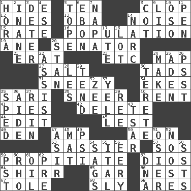 ACROSS 1. Flintstone garb 5. "___ Little Indians" 8. Hoof sound 12. Washington bills 13. Chief or king in Benin or Nigeria 14. Annoying sound 15. Pace 16. Census information 19. One (Scot) 20. Legislator 21. Part of Q.E.F. 23. And so on (abbr.) 24. Atlas unit 27. Table seasoning 30. Small boys 31. Dwarf with a sinus problem 34. Supplements with great effort 35. Indian skirt 38. Contemptuous expression 40. Monthly bill 41. Sliced desserts 42. Keyboard key 44. Prepare for publication 45. For fear that 46. Lair 47. Electrical Unit 50. A really long time 53. More impudent 57. Distress signal 59. Conciliate 63. "Vaya con ____" 64. Bake eggs in their shells 65. Slender fish 66. A home for chicks 67. Lacquered or enameled metalware 68. Roguish 69. Ancient Greek god of war DOWN 1. Israeli folk dance 2. Lacking in sense or substance 3. Prevent from occurring 4. Compass dir. 5. Drink excessively 6. Inky black, to poets 7. California wine valley 8. Small bed 9. Cards in a Roman deck? 10. Bear (Spanish) 11. Fenced enclosure 14. Drug cop 17. Shoshoni 18. Car dealer's back yard 20. Comedian Laurel of Laurel & Hardy 22. Aid 24. Cause to be 25. An important port of Yemen 26. Inconspicuous attention getter 28. French article 29. Look after 30. Cigar-shaped 32. Last letter of the English alphabet 33. Shout 35. Drove too fast 36. Helper 37. It's straight from the horse's mouth 39. To sift 43. Russian ruler of old 47. SW Saudi Arabia district 48. Floor covering 49. 23rd letter of the Greek alphabet 51. Flexible twig of a willow tree 52. Trap for birds or small mammals 54. Settles 55. Slanted text style (abbr.) 56. Suggestive of the supernatural 58. Fast planes 59. Pacific Standard Time (abbr.) 60. 17th letter of the Greek alphabet 61. Lubricate 62. Before (prefix) 63. Heredity factor (abbr.)